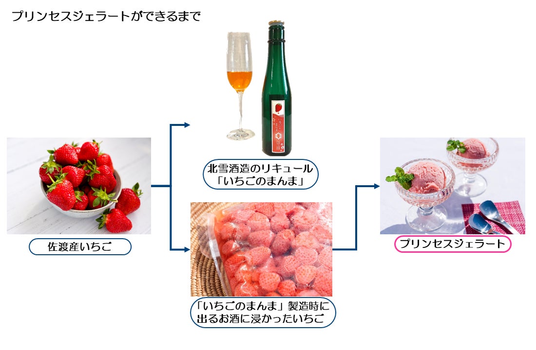 北雪酒造のリキュール『いちごのまんま』の製造工程ででる、お酒に浸かった佐渡産いちごをベースにつくった、いちごのジェラートです。一つ一つ丁寧に手づくりすることで佐渡産いちごの甘みやフレッシュさを逃がさず、なめらかな口当たりの中にいちごのつぶつぶ感を感じていただけます。