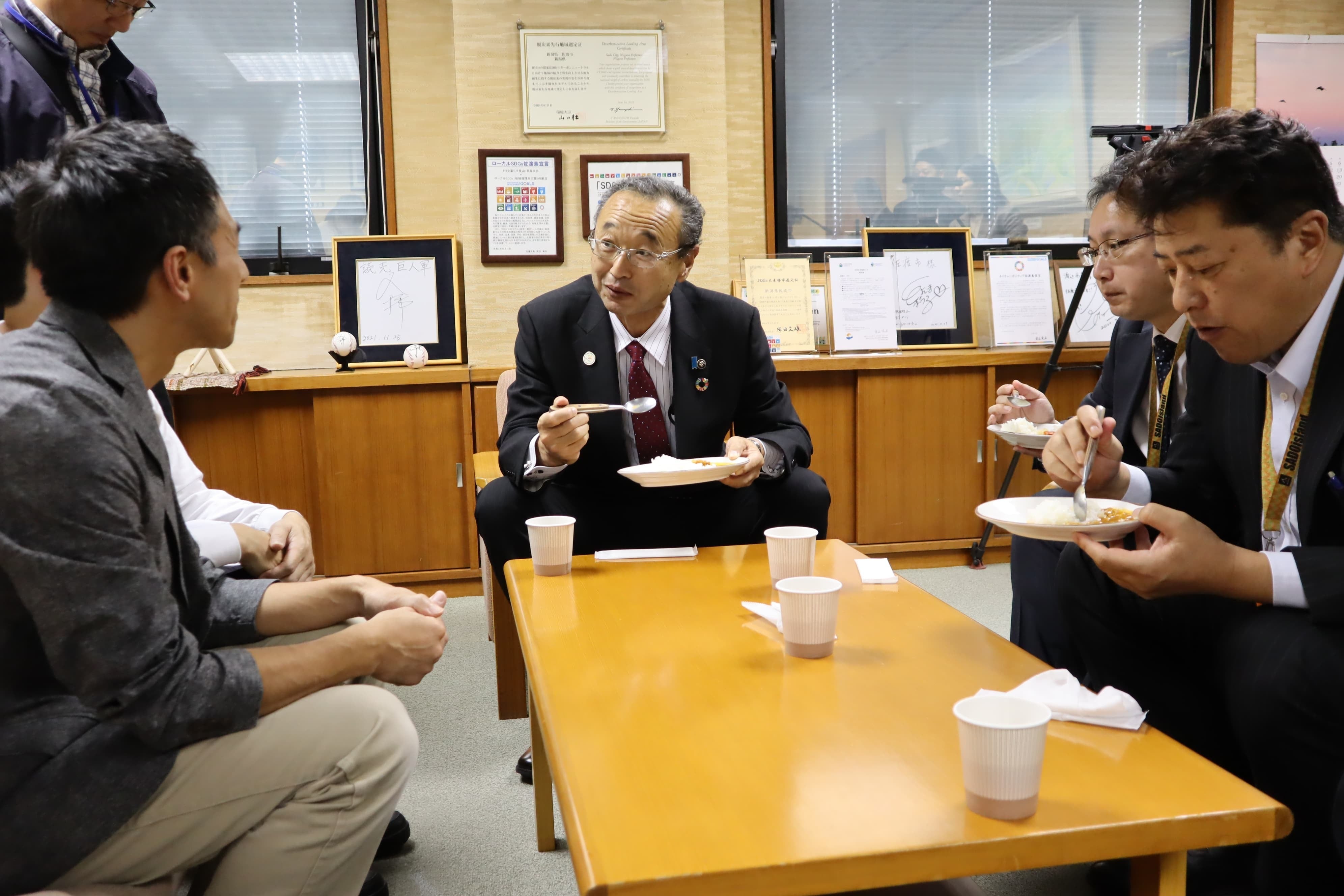 渡辺竜五市長と市幹部職員7名に「佐渡ベジタブルカレー」「プリンセスジェラート」をご試食いただきました。