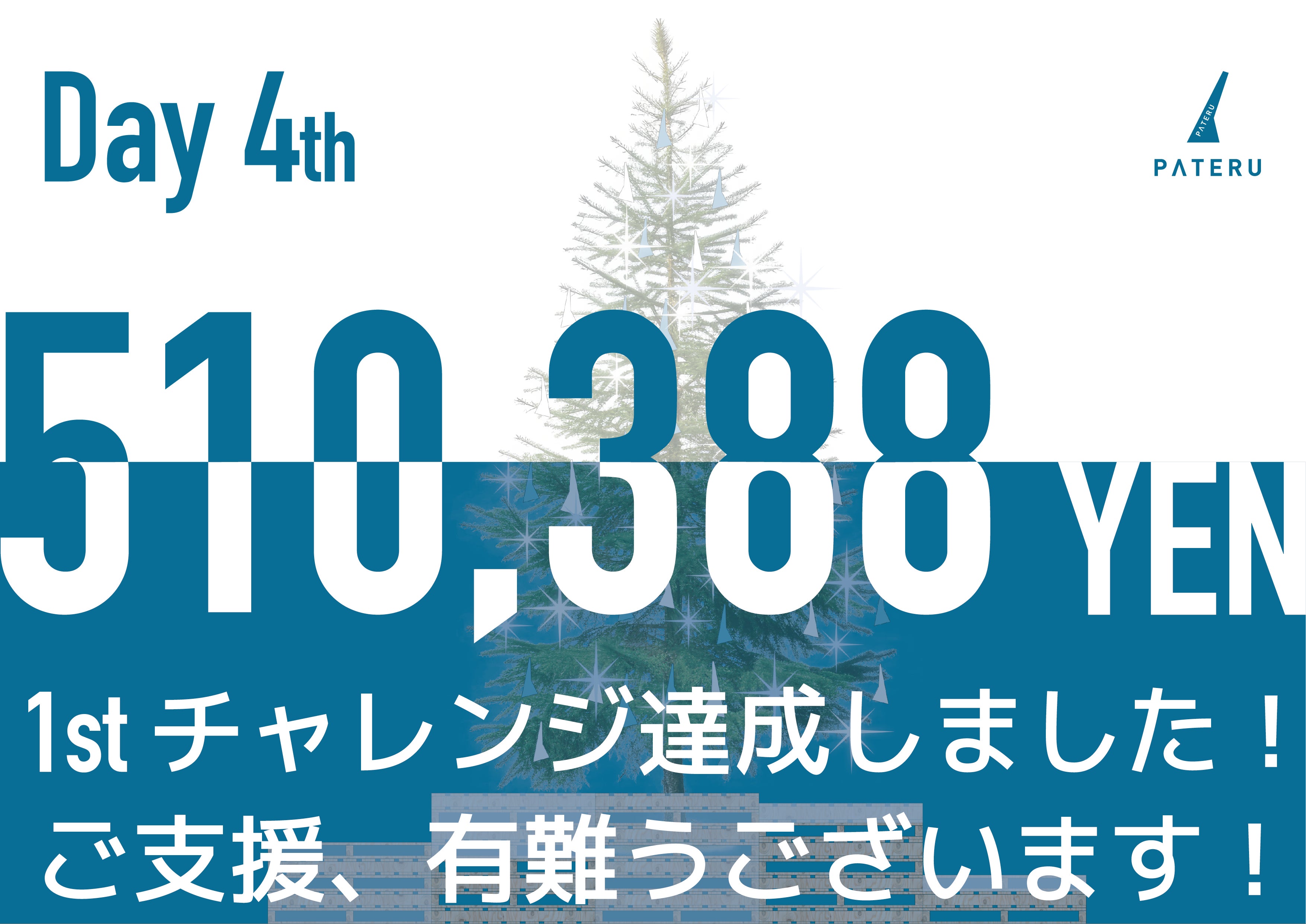1stチャレンジ達成!皆様ご支援有難うございます!!トータルチャレンジにして38%のMOMINOKIが見え始めています!この時点で空地使用料+土台+MOMINOKI+電源の設置を進めさせて頂きます!! ネクストチャレンジは100万円!! クリスマスツリーの真骨頂電飾をMOMINOKIに纏わせましょう!そうする事に皆様からご支援頂いたプレートがキラキラと八尾の空地に輝きます。PATERU一同最後までやり切ります!!引き続き皆様のご支援+拡散を宜しくお願い致します!PATERU