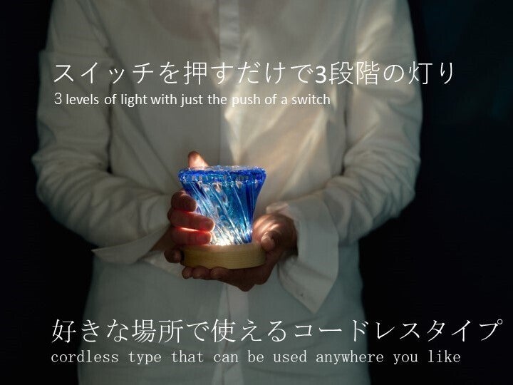 「アサガオランプ」は色ガラスの新たな楽しみ方を模索し、光とガラスと切子の新たな楽しみ方を提案したいと思いつくったコードレスタイプの灯りです。スイッチを押すだけで3段階の灯りが切り替えられ、お好きな場所でお使えいただけます。