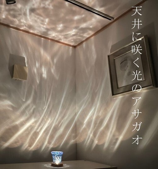 ガラスの美しさは光を透過し反射させること。地球の一部である鉱石物からつくる色被せは自然界からのギフトと捉え、独自の吹きガラスの技法と切子加工を組合せ、天井や壁に光の世界を創り出す「アサガオランプ」を開発しました。