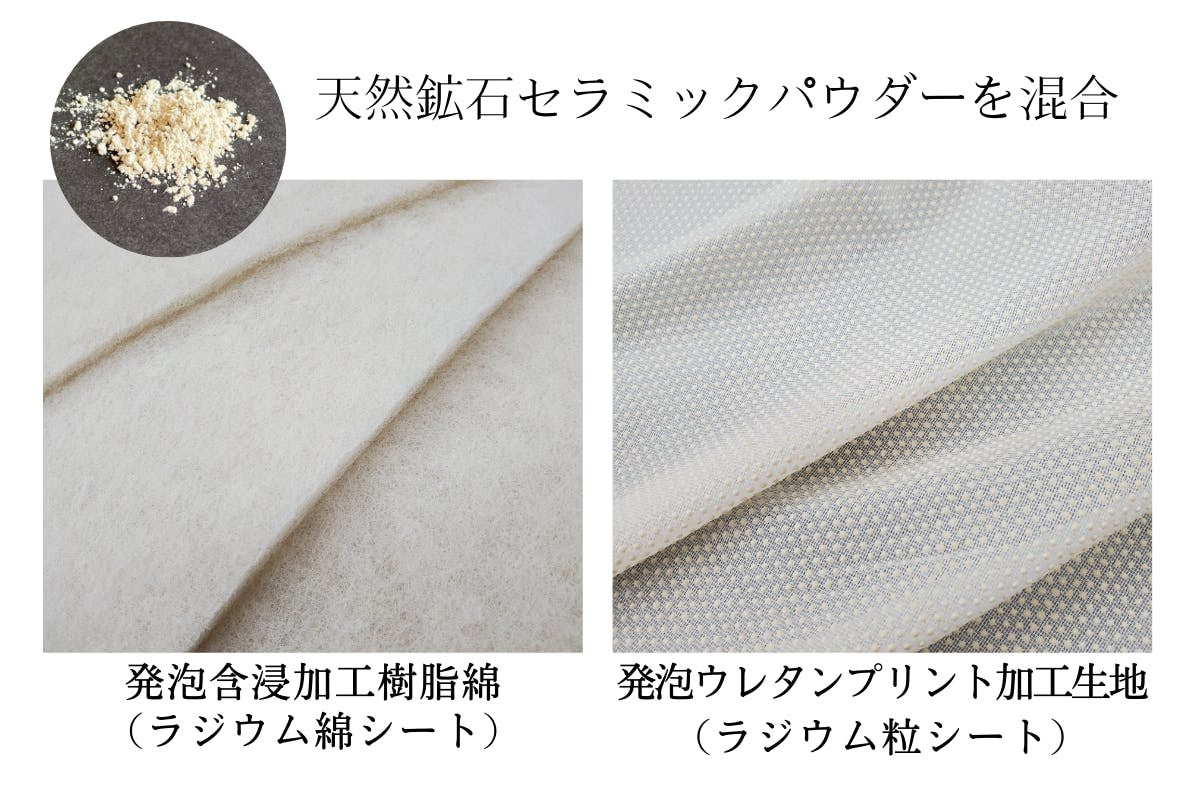 ラジウム粒シートは薄くてドレープ性が高いことから、掛け布団などにも利用することが可能。プリントサイズは小さなドットづくりとなっており、ドーム状に発泡させた事で表面積が増え、効率的に機能性を発揮します。芯地の厚みが薄いため、ラジウム綿シートとの併用によって、ホルミシス効果を高めるために使用しています。