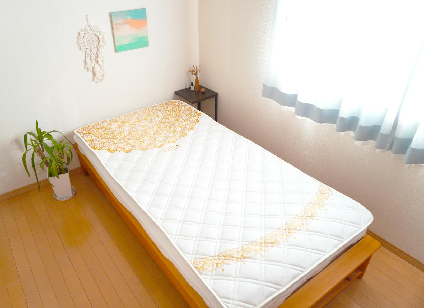 大きく描いた金色の曼荼羅アートは壮大なパワースポットです。その上で優雅に眠る感覚を味わい、心の健康を養っていただきたいと思います。