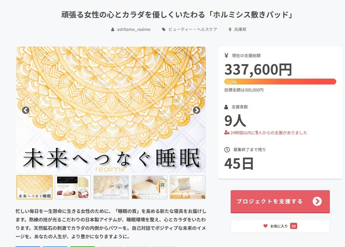 おかげさまで、「目標額30万円」という第1ゴールを達成することができました。皆さまのご支援・ご協力に感謝申し上げます。しかしながら、「睡眠の質」「心身の健康」「自己実現」という大きなテーマを掲げ、弊社の想いと商品を世の中に普及させていくためには、まだまだ力が不足しています。まずは、限られたこの45日間のプロジェクトの中で、最善を尽くしてまいります。2日目の本日より、第2ゴールを設定し、情報提供に努めてまいりたいと思っておりますので、引き続き、皆さまの温かいご支援・ご協力のほど宜しくお願い申し上げます。