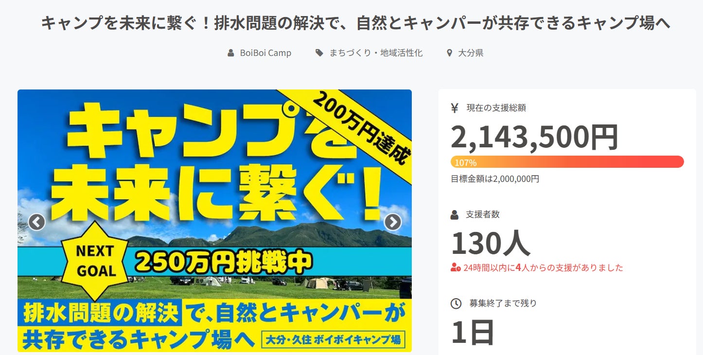 こんにちは。ボイボイキャンプ場管理人の渡邉です。ついにプロジェクト終了まで残り8時間となりました!おかげさまで,開始からの支援総額は2,168,500円を達成し,NEXT GOALの250万円まであとわずかとなっています。今回のリターンはプロジェクト終了後には入手することができないものも含まれます。ご支援がまだの方、追加支援をご検討の方はお急ぎ下さいますようお願いいたします!最後までご支援お待ちしております!