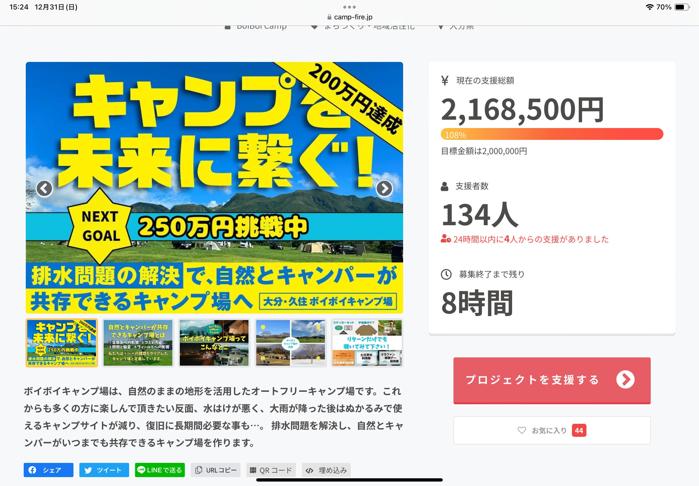 ご支援者様、新年明けましておめでとうございます。ボイボイキャンプ場管理人の渡邉です。プロジェクト開始から37日間で136人もの方々よりご支援頂き、無事プロジェクトの終了を迎えることができました。多くのご支援本当にありがとうごいました!今後はリターンのお届け準備に入ります!引き続き、「ボイボイキャンプ場」をよろしくお願いいたします。