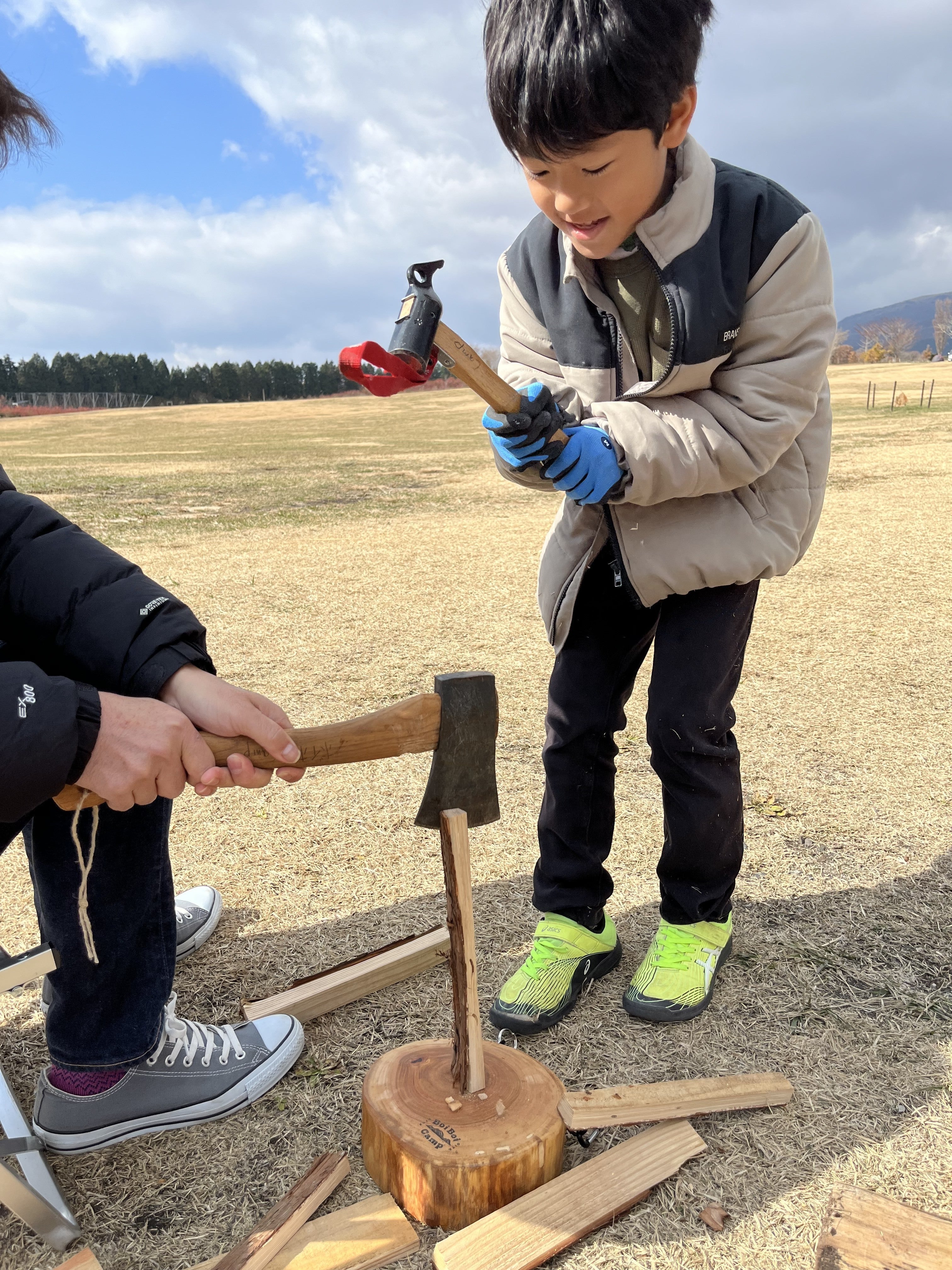 薪は動画のように斧を大人が支えて、ペグハンマーでたたくとお子様でも