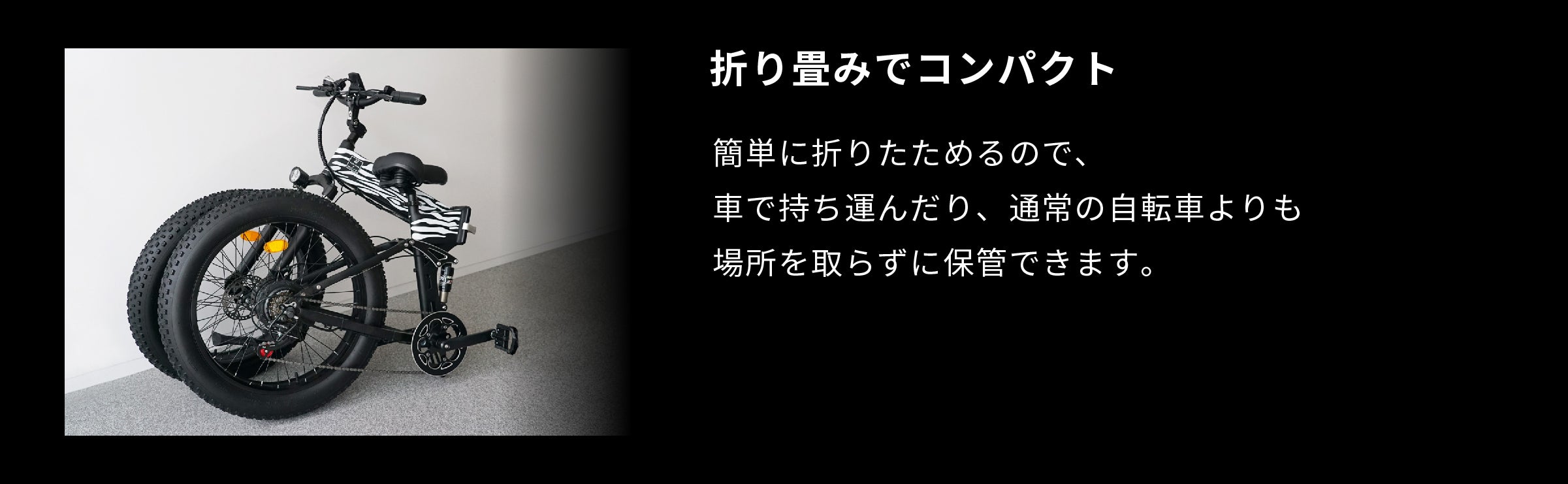 2ステップで簡単に折りたためるので、車で持ち運んだり、通常の自転車よりも場所を取らずに保管できます。