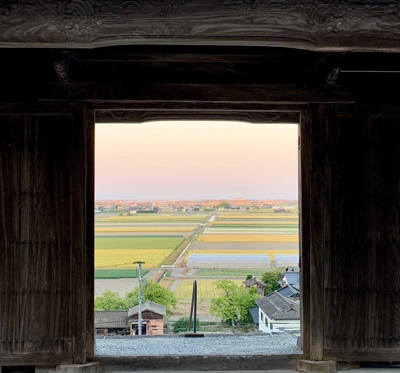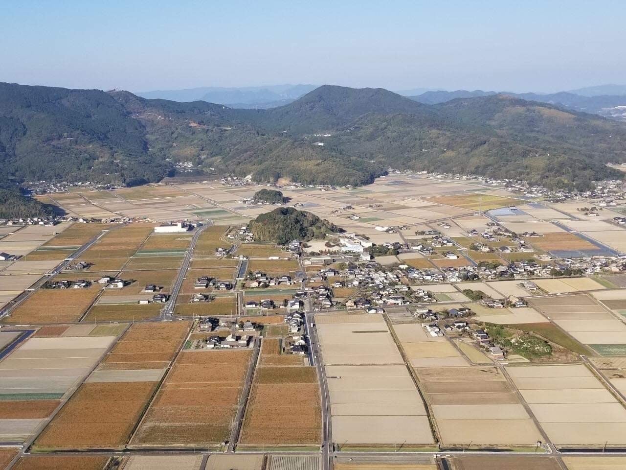 須古地区:一面に広がる田畑が美しいです。真ん中に見えるこんもりした山が須古城跡。
