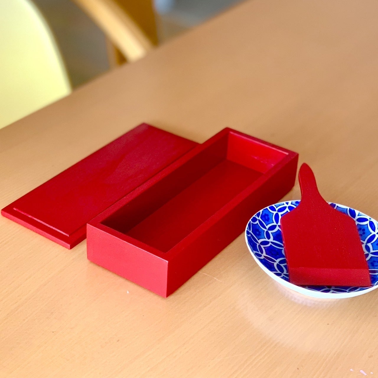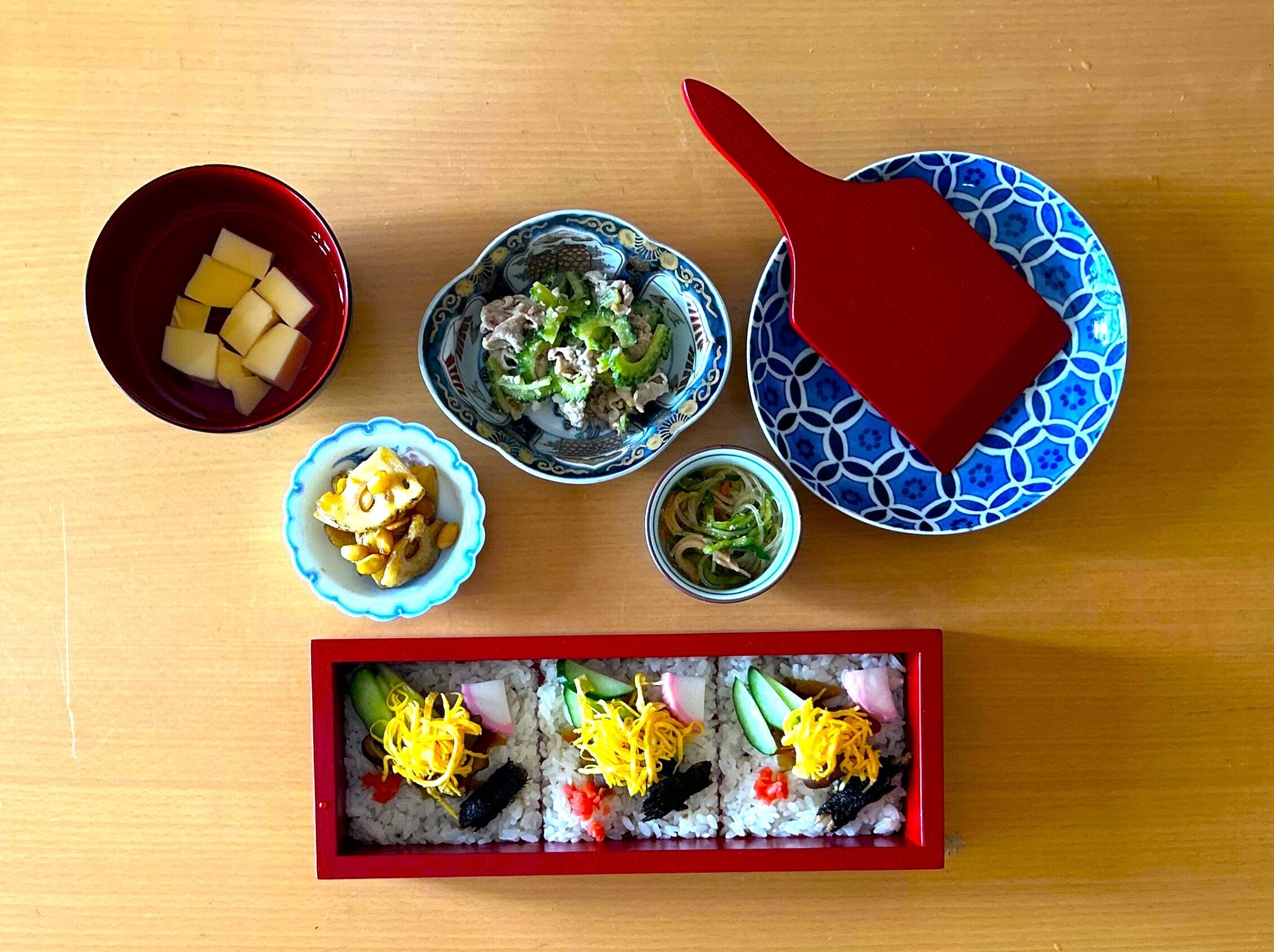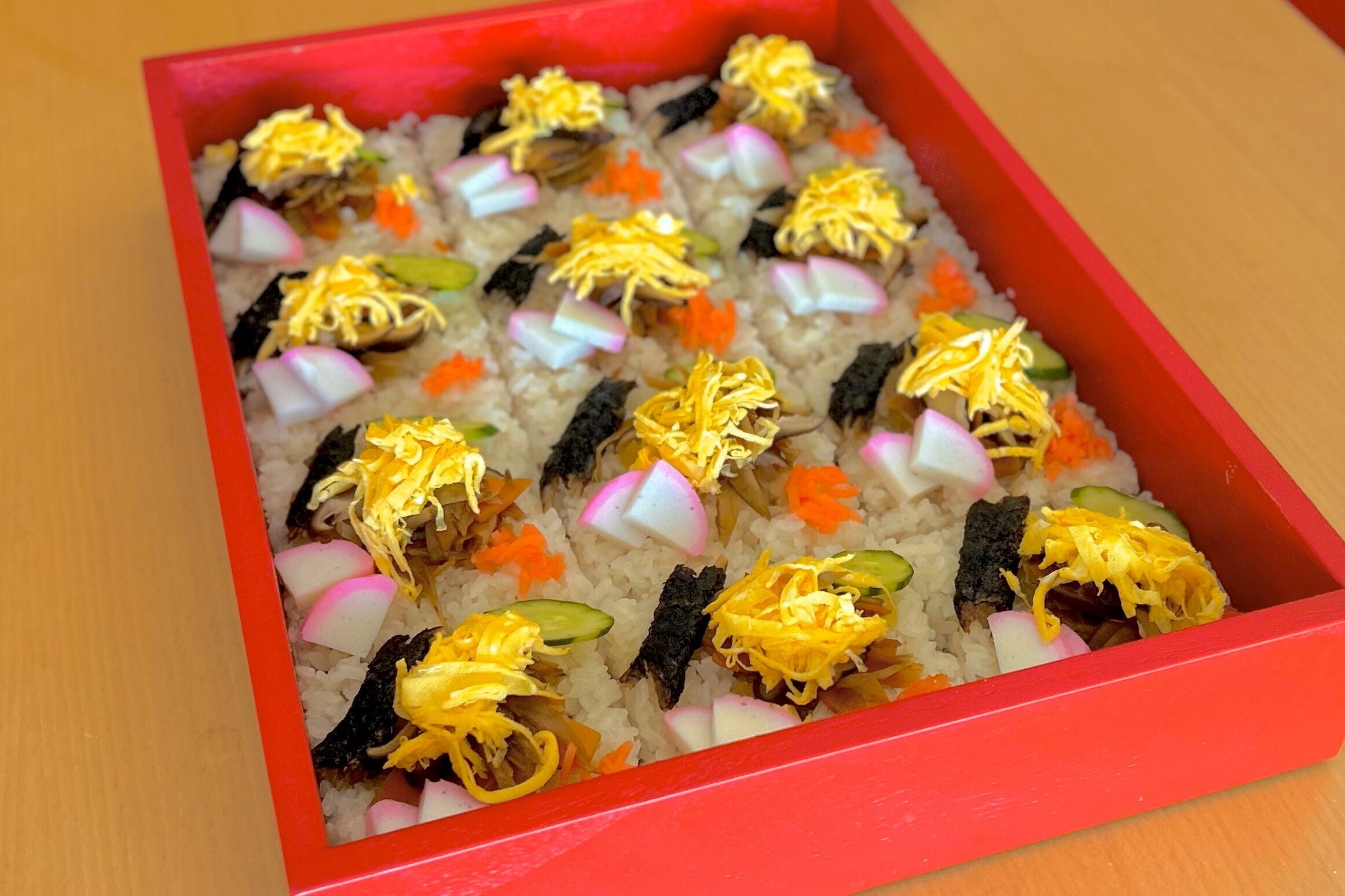 目の前にある赤い木箱。これはなんだ?そして、このへらみたいなものはなんなんだ?ふたを開けるとちらし寿司のような、なんだか見たこともないものが並んでいます。でもすごくきれい。整然と並んだごはんと具材たち。