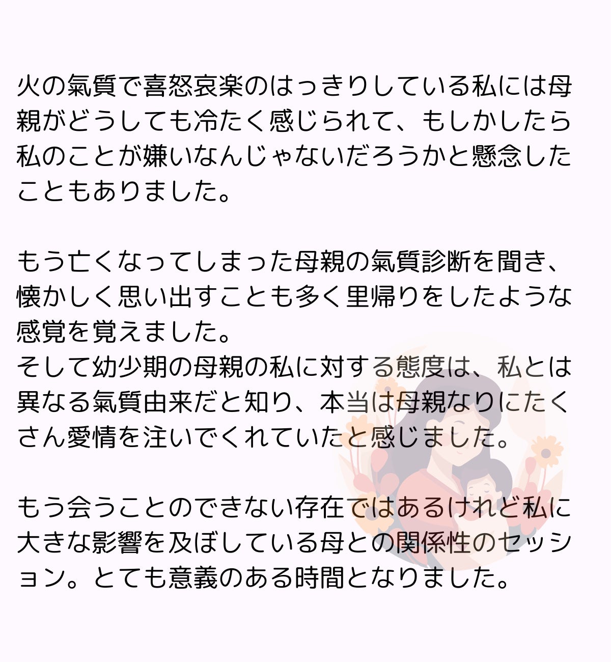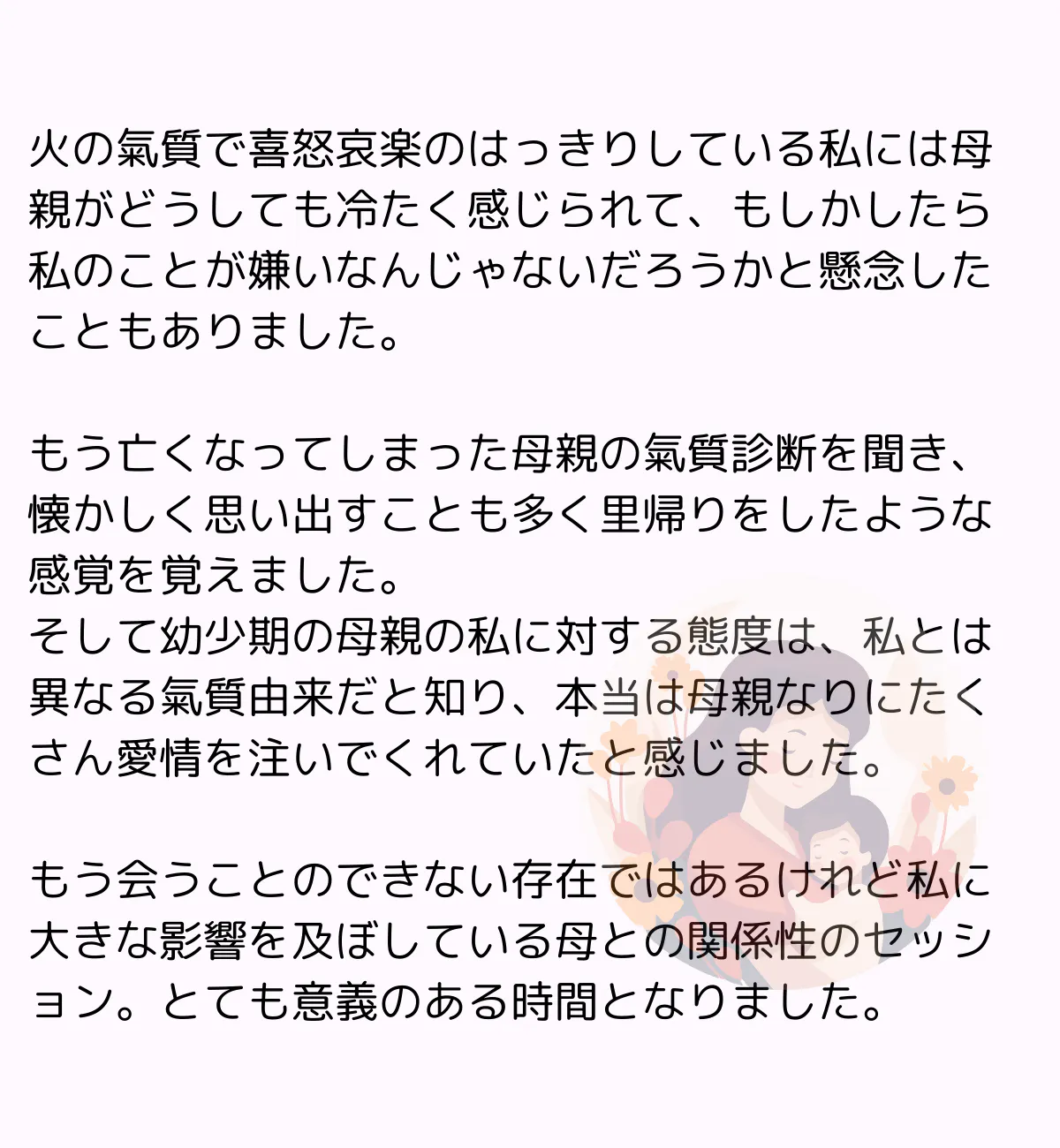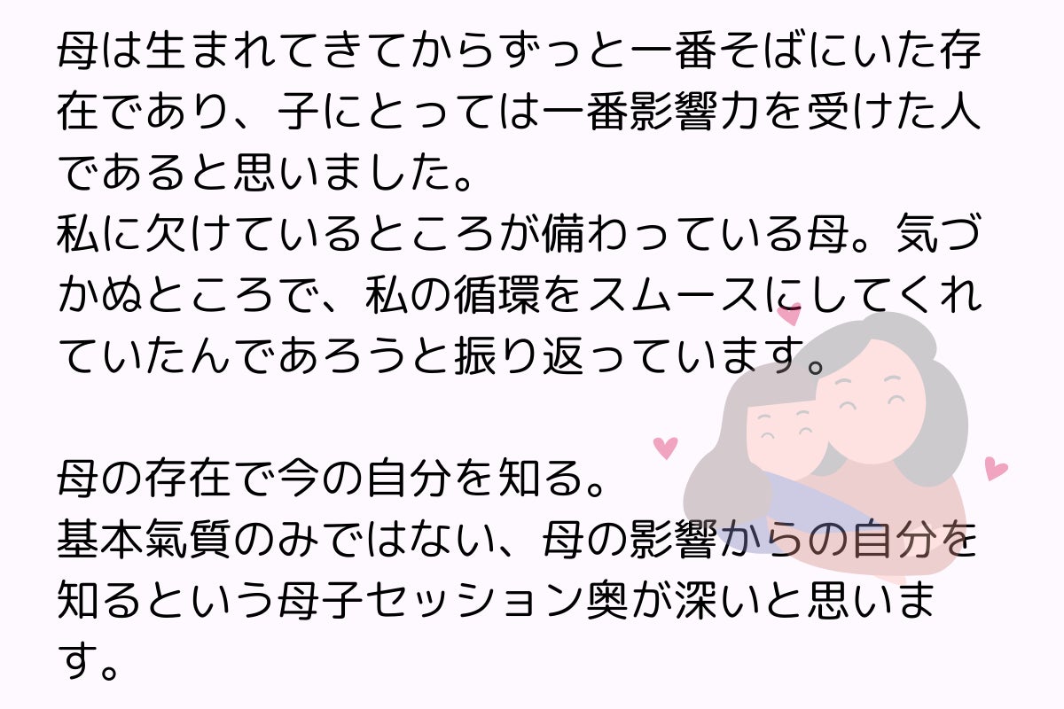 母子セッションとは、母親と自分との関係を理解することを通じて、自分自身をさらに理解するためのコンテンツです。