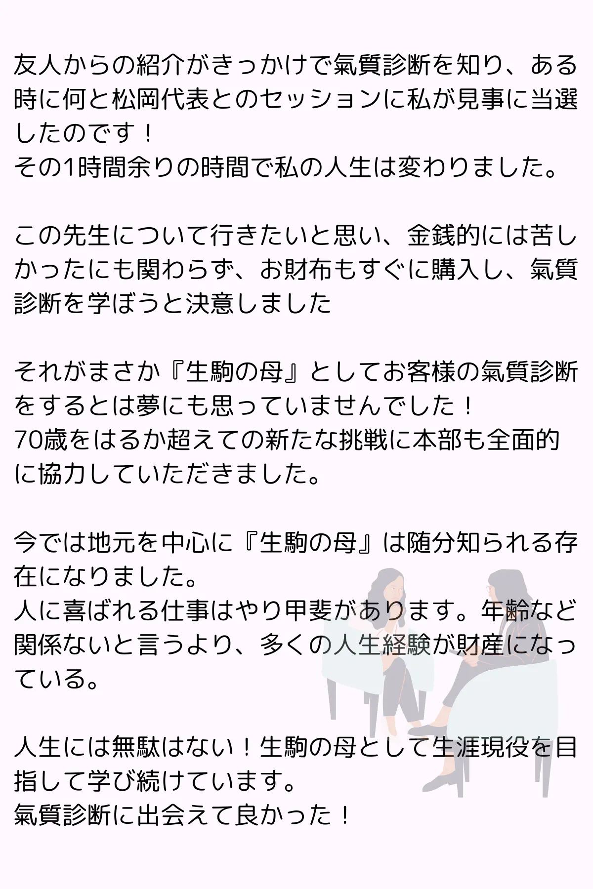 このお仕事は、年齢を重ねるということがアドバンテージになり、過去の経験や背景が困難なものであったとしても、氣質診断士はそれらを全て活かす、つまりプラスにすることができるお仕事なのです。