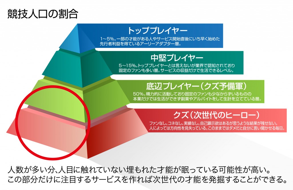 私たちの考える『KUZ』プロジェクトはそのピラミッドの底辺にいる人物をより多くの人の目に触れてもらうきっかけを作ることを目的にしています。