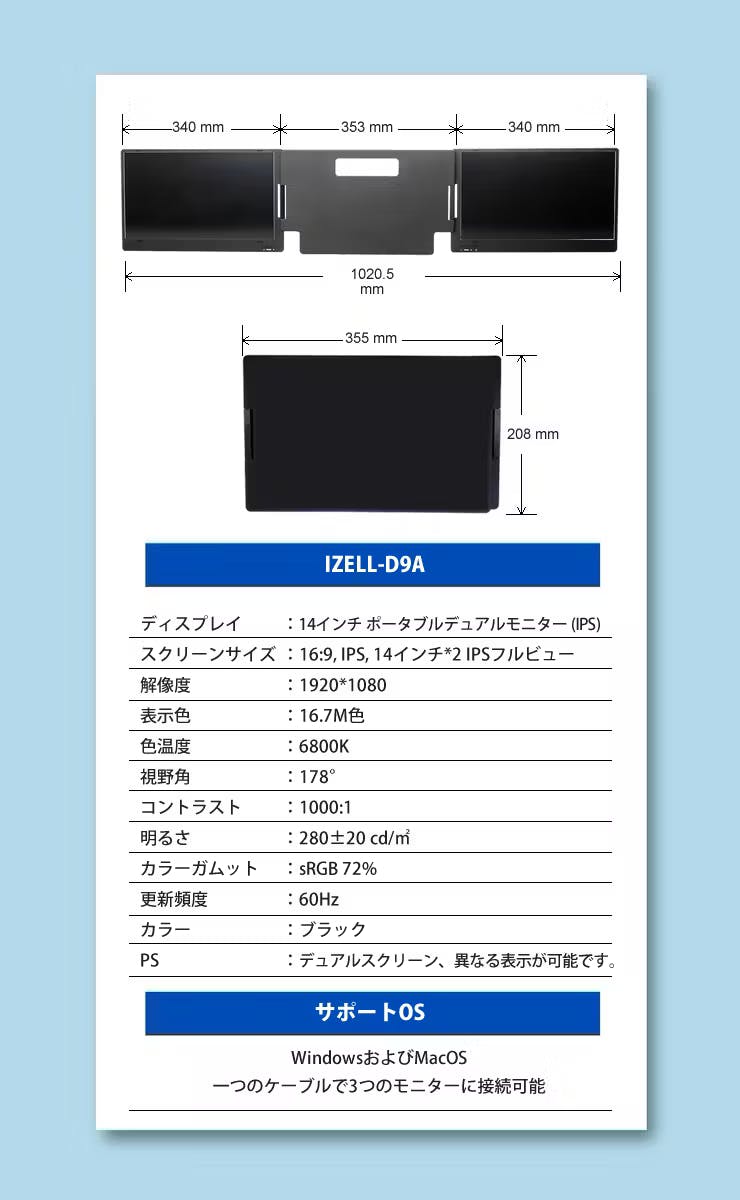 商品の特徴:IZELL-D9A 14インチ ポータブルデュアルモニター