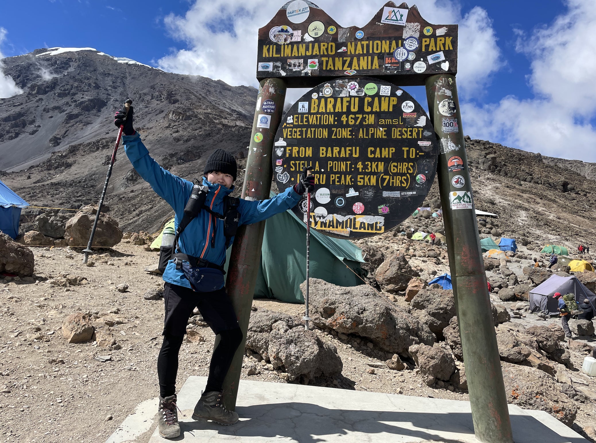 第十三章 人間万事塞翁が馬この日はバランコキャンプ(3900m)から、最後のキャンプ地であるバラフキャンプ(4700m)を目指す。従来のマチャメルートでは、この間にあるカランガキャンプ(4000m)で宿泊するはずであったが、前日にガイドのジャコブから、1日行程を短くしないか、と提案があった。事前のキリマンジャロ登山の下調べで、この提案をされることはある程度予想していた。彼らが提案しなかったら、私の方から提案するつもりであった。彼曰く、今後、良い天気が続くかわからないから、今のうちに登ったほうが良い、とのことだった。彼らにとっても早く下山すれば、早く家族と会え、次の登山ツアーに行くことができる。登山シーズンは稼ぎどきであるはずなので、できるだけ多くのツアーに同行した方が、稼げる。また、私自身、この時点で高山病の症状は一切出ておらず、体力的にも全く問題なかった。この提案はwin-winなわけだ。だが彼らの方から提案してきてくれたのは、私としても好都合であった。というのも、私はこの登山が終わったら、彼らの会社が主催するサファリツアーにも参加する予定であった。せっかくアフリカに来たのだ。本物のワイルドライフは見ておきたかった。1日早く下山するということは、サファリまで1日暇ができるということだ。彼らの方から提案してきてくれたおかげで、行程を早める分、同額でサファリを1日伸ばしてくれないか、と交渉することができた。2日間のサファリが同額で3日間に延びた。ラッキー。後日談であるが、このサファリのホテルが最悪であった。エアコンもシャワーもなく、虫が入り放題の部屋。この交渉をしたせいで、このホテルに2泊もする羽目になった。こんなことなら、交渉せずに、良いホテルの部屋で、ビールを飲みながら登山中でたまっていたアニメを消化していたかった。人生における幸不幸は予想できない。第十四章 ライアンとローラ7時にバランコキャンプを出発すると、すぐ目の前にこの日の難所であるバランコウォールが聳え立っていた。バランコウォールは300mほどにもなる急登である。遠目にバランコウォールを登る登山者たちの列が見えた。これは日本で言うと、槍ヶ岳山荘から槍ヶ岳山頂までの光景に似ていた。トレッキングポールをしまい、作業用手袋をつけ、登り始める。現地のポーターたちは頭に20kgの荷物を乗せ、この急登を登っていた。彼らの体感とバランス力には本当に驚かされる。槍ヶ岳のような急登を覚悟して登り始めたが、見掛け倒しであった。1時間ほどであっさり登り切れてしまった。バランコウォールを上り切ると、開けた場所に出た。どうやら定番の休憩スポットらしい。バランコウォールを上り切ったものたちが、休憩していた。天気は良く、キリマンジャロの頂がくっきりと見えた。また反対方向には、タンザニアで2番目に高い山である、メルー山(4566m)が見えた。メルー山はキリマンジャロの西側70kmに位置している。メルー山は成層火山であり、過去の大噴火の前はキリマンジャロよりも標高が高かったとする説もあるらしい。近くに見覚えのあるアジア人の男女がいた。この二人は登山初日からよく見かけていた。アジア人は珍しいので、よく目につく。おそらく私と同じ入山日で、行程が同じなのであろう。男性は大柄の筋肉質で、特徴的な柄の長袖コンプレッションシャツを着ていた。女性は小柄であったが、登るスピードがとても早かったのが印象的だった。どちらも20代後半ぐらいだろうか。ちょうど、お互い休憩中であったので、話しかけることにした。男性はライアン、女性はローラと名乗った。中国人らしい。彼らは中国国内の5000m級の山に登ったことがあり、5000m以上の山は今回が2回目だと言っていた。彼らも私のことを認識していたらしく、お互いよく見かけるよねと言う話をした。お互い無事頂上に辿り着けることを祈り、彼らとは一旦別れを告げ、バラフキャンプを目指す。第十五章 前夜バランコウォールを経て、カランガキャンプに到着した。ここで昼食にするらしい。昨日の昼食のようにランチボックスかと思いきや、なんと昼食を食べるためにわざわざテントを立ててくれていた。2日分の行程を1日で登る分の配慮であろうか。ご飯もちゃんとしたものが出てきた。この昼食で出てきたフライドポテトはとても美味しく、ぺろりと全て平らげた。このポテトが後の私の体に多大な影響を与えることとなる。昼食を食べ終え、3時間ほど歩くと、無事バラフキャンプへ到着した。標高は4700m。ラバタワーが標高4600mであったため、未知の領域である。夕食を終え、テント内で日記を書いていると、ガイドのジャコブがテントに来た。今日の23:00に起床し、23:30に出発するらしい。これには僕も驚いた。想定よりも出発時間が早かったからである。今の時刻は19:00。あと、4時間で出発である。今日はすでに、のぼり1200m、距離10kmを歩いていた。これが行程を1日早めると言うことか、