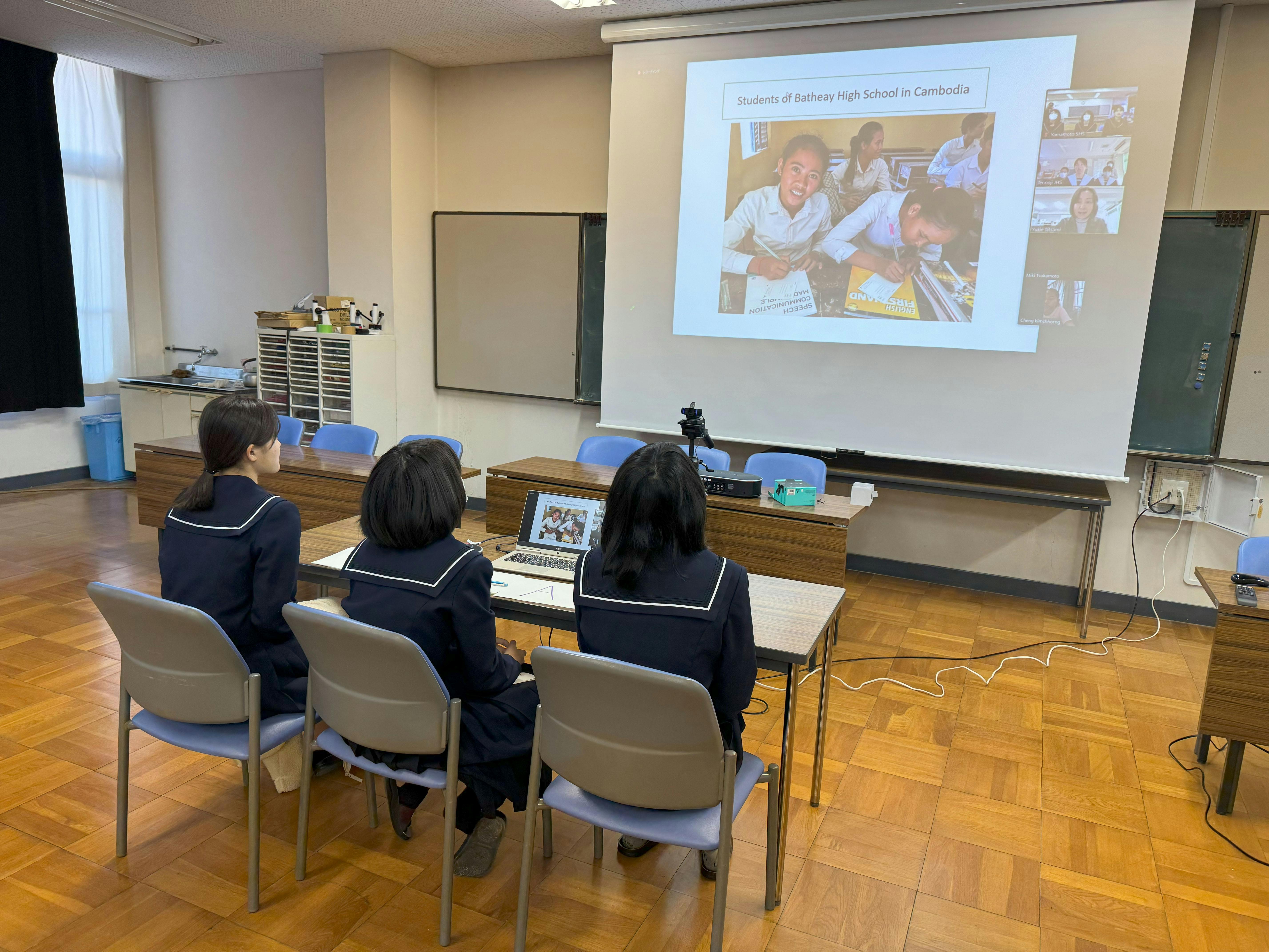 まずはアイスブレーキングとして両国にまつわるクイズを出題し、緊張が解けてきたところで各自の自己紹介や学校紹介をお互いに行い、質問をしました。その後、両国の文化について簡単なプレゼンテーションを行い、2人が訪問する学校や日本のこと、カンボジアのことについて理解を深めました。私の勤務先の生徒も参加しましたが、緊張した表情が徐々にほぐれ、楽しそうな表情がうかがえ、あっという間に終了しました。