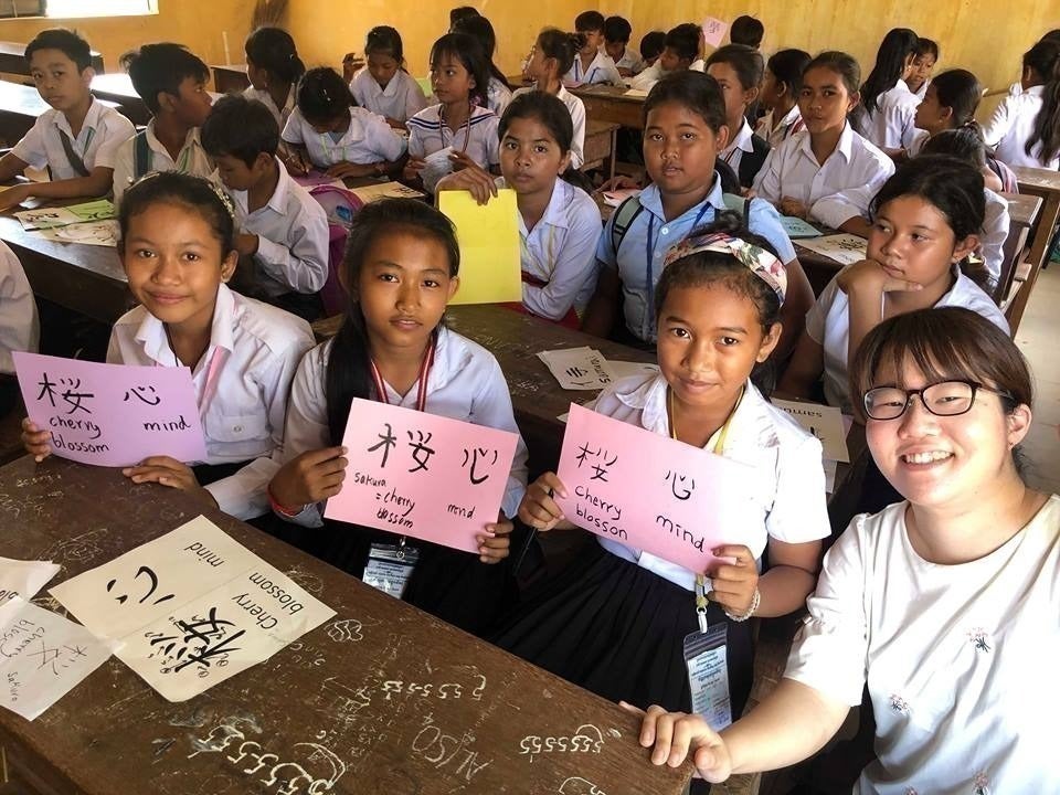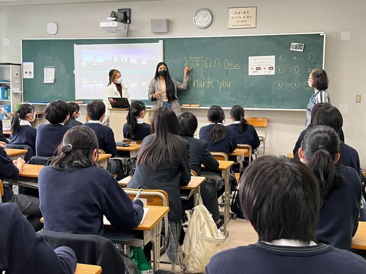 さらに、新プロジェクトとして、高校時代奨学金を受けていた学生の中から優秀な女子学生を日本に招待し、ホームステイや観光をしながら日本の中学・高校・大学を訪れ、学生たちと交流を持つというプロジェクトも行っています。学生にとって、人生の大きな刺激になるだけでなく、努力すれば夢がかなうということを実感し、さらに学業にいそしむきっかけになるだけでなく、日本の学生からも、自分たちの同世代の学生がここまで英語を学び、頑張っている姿を見て少なからず刺激を受けるという相乗効果も見られるようになっています。コロナの影響で、2年ほどは学生を日本に招待することができなくなってしまいましたが、ようやく昨年度(2023年1月実施)、リンとネスという2名の学生を日本に招き、日本の中高生、大学生と交流を持つことができました。また、事前交流として、日本に来ることになった学生と、日本の中高生がオンラインで自己紹介などの交流をしたり、日本でフィールドトリップをした際にサポートした大学生がカンボジアにわたり、向こうで交流したりする機会もあります。