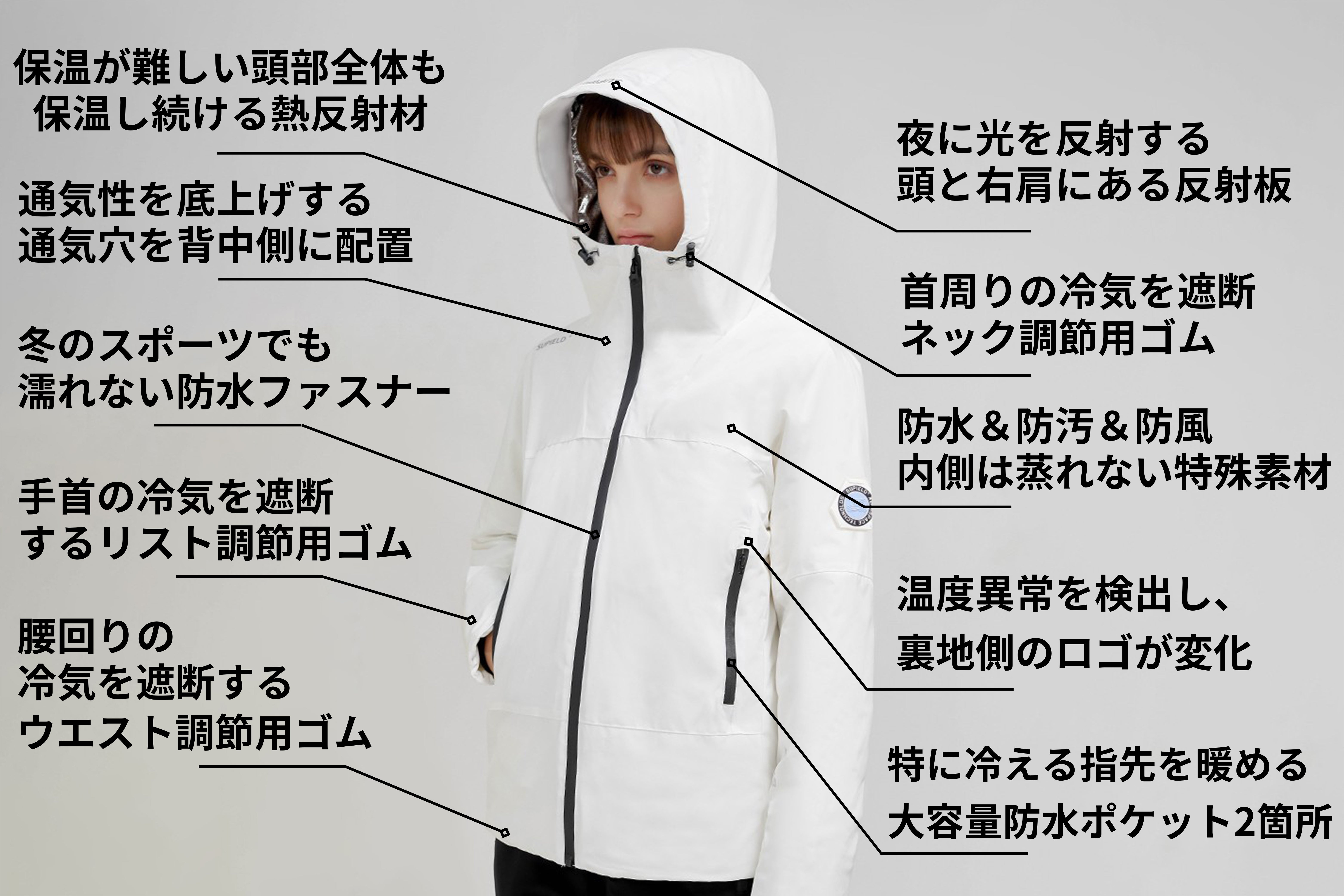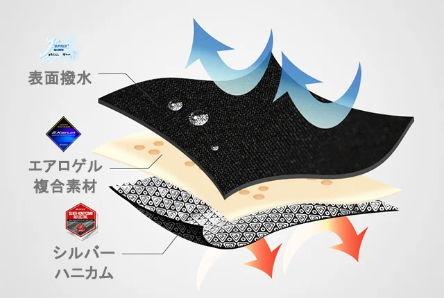 ナノ撥水加工と防風技術で冷気をシャットアウト。通気穴で快適な通気性を確保し、エアロゲルが適度な熱を維持。さらに、赤外線反射の「シルバーハニカム・リフレクティブ」技術で高保温。アウトドアでも蒸れず、快適に着用仕手頂けます。