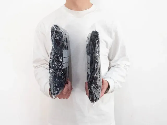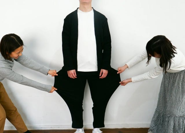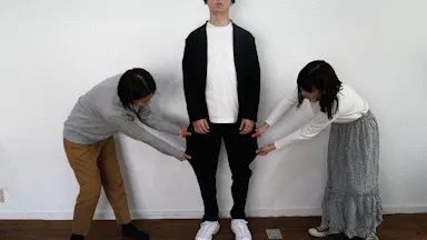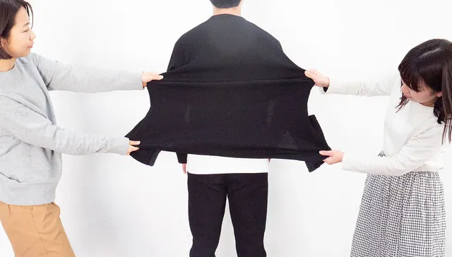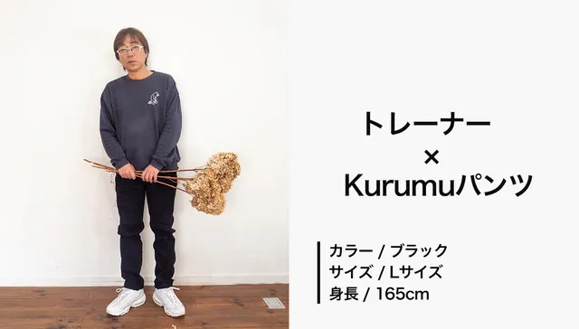 ・伸縮性の高い素材なので、ウエストや袖&裾は横方向で3cm〜8cm程度の伸縮があります。オーバーサイズ気味に着用してもらっても大丈夫です。