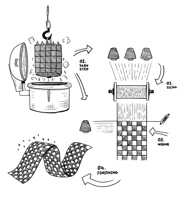 播州織は先染め織物と呼ばれる織物です。先染め織物は、その名の通り先に染めた糸を織り方だけで柄を表現するものであり、糸の芯まで染料が行き渡るため、色落ちしにくい織物にすることができます。