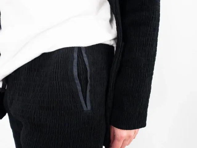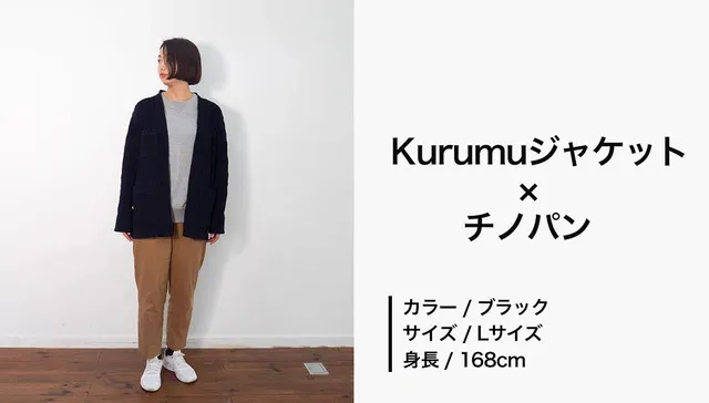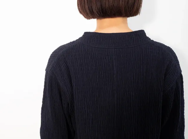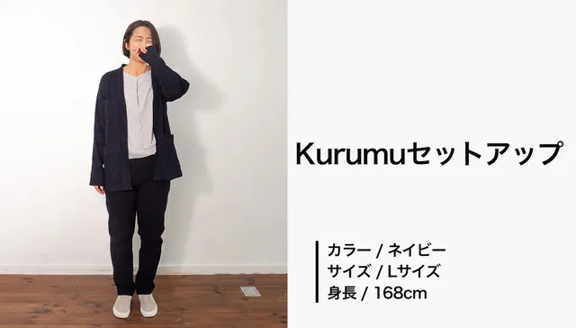 生地の凹の底辺は面ではなく辺で肌をとらえ、凸部分の底辺が肌をとらえる時、空気を含んでいる空間として肌をとらえます。 この凹凸による流風のテクスチャー(織物の造形)が、カラダを辺と空気と適度な伸縮でとらえる、"くるまる" という感覚を生んでくれます。Kurumuのネーミングはその着心地に由来しています。