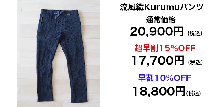 第1弾としてジャケット&パンツをリリースします。着心地が抜群なのに、綿素材の概念を超えた「通気性」「伸縮性」「軽量性」を兼ね備えた「流風織」は、季節を選ばない新感覚の着心地感を体感できます。