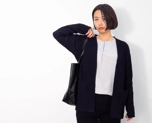 ジャケットのフロント部からはあえてボタンを排除し流風織ジャケットにしなやかな表情を持たせています。その一方でジャケットの持つシルエットの美しさを崩さないうようにポリエステルの見返しをつけています。