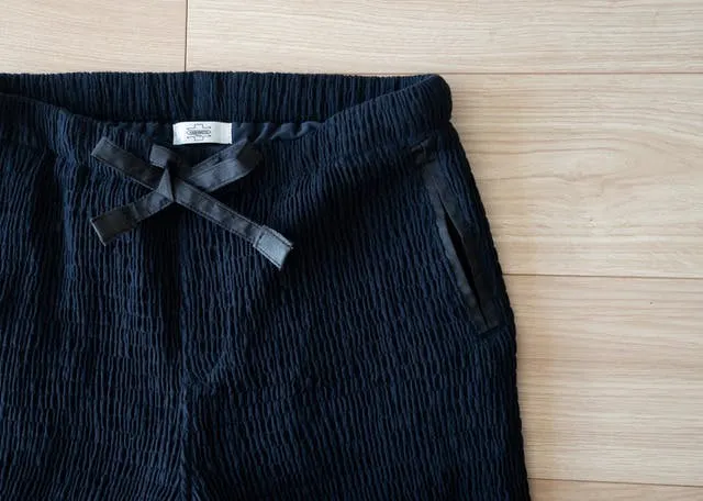 腰紐とポッケットの開口部分はポリエステル仕様。こうすることでパンツに統一感のあるシャープな表情を持たせました。またポケットの内側の生地も流風織なのでポケット口が開いても外観を損ねません。