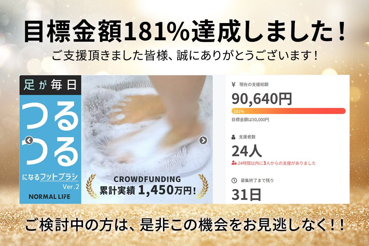 【1日2分!足のニオイと古い角質にサヨナラ。立ったままゴシゴシ洗えるフットブラシver.2!】がプロジェクト公開からわずか1日で目標を達成し、現在、達成率181%となりました!