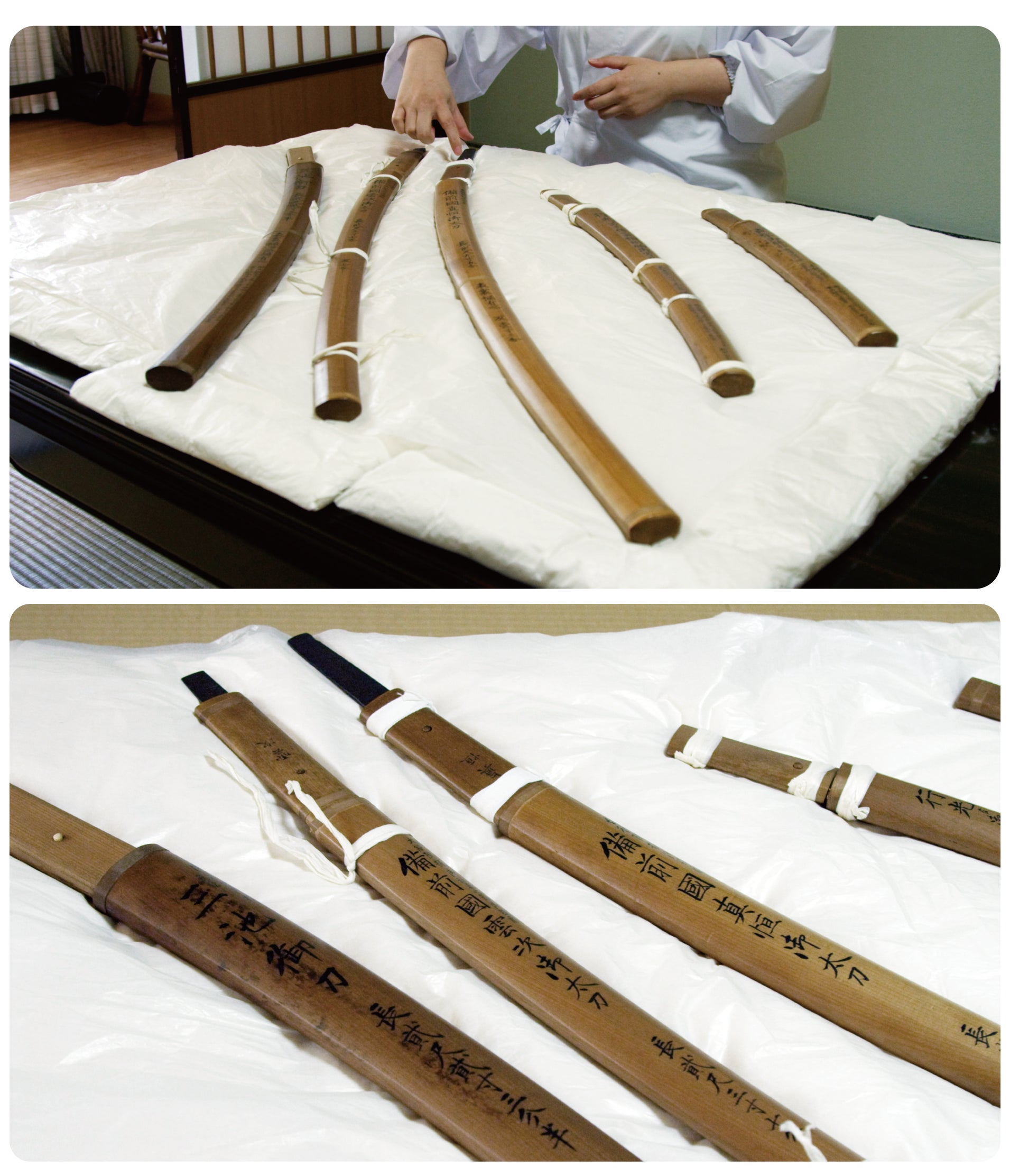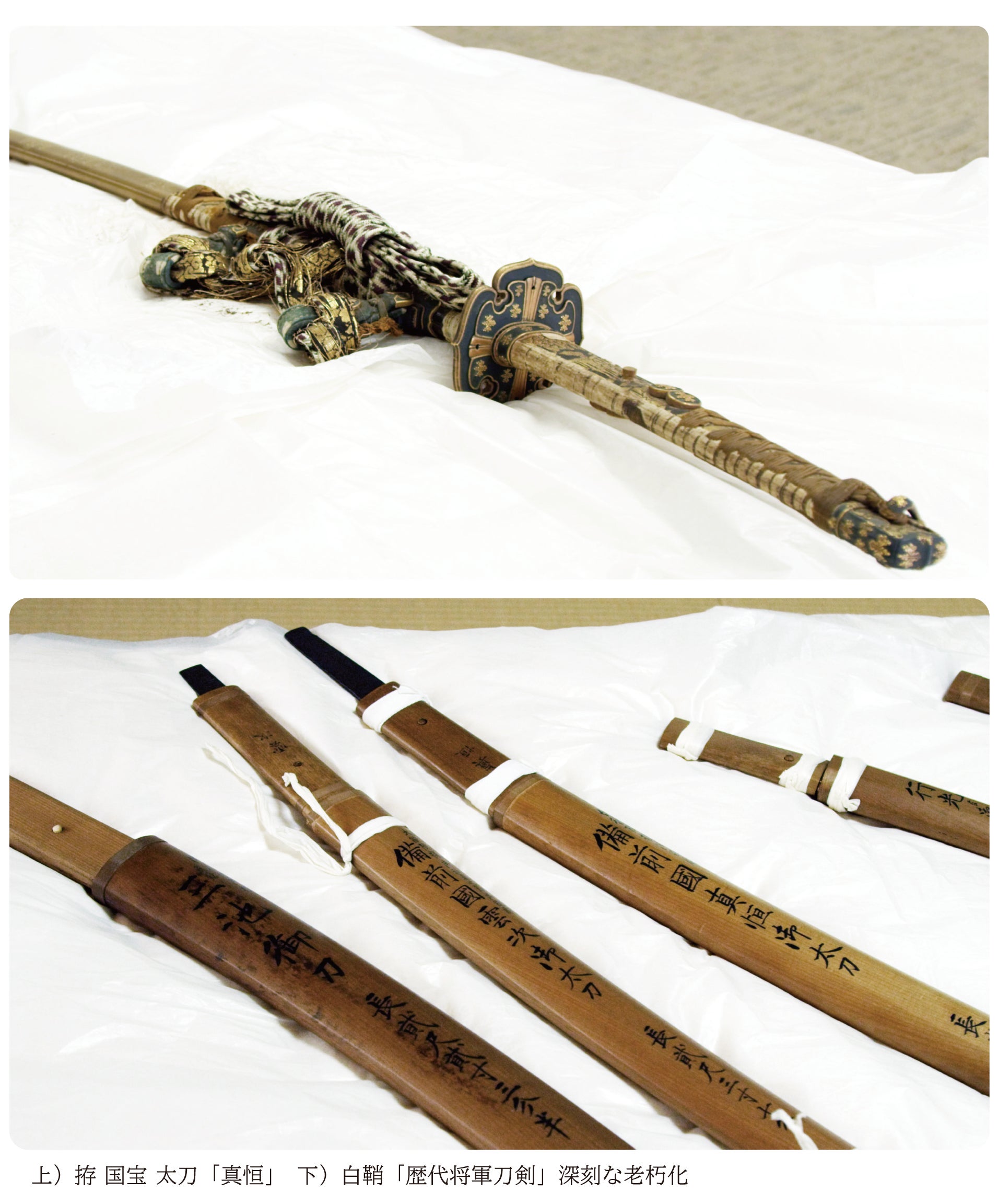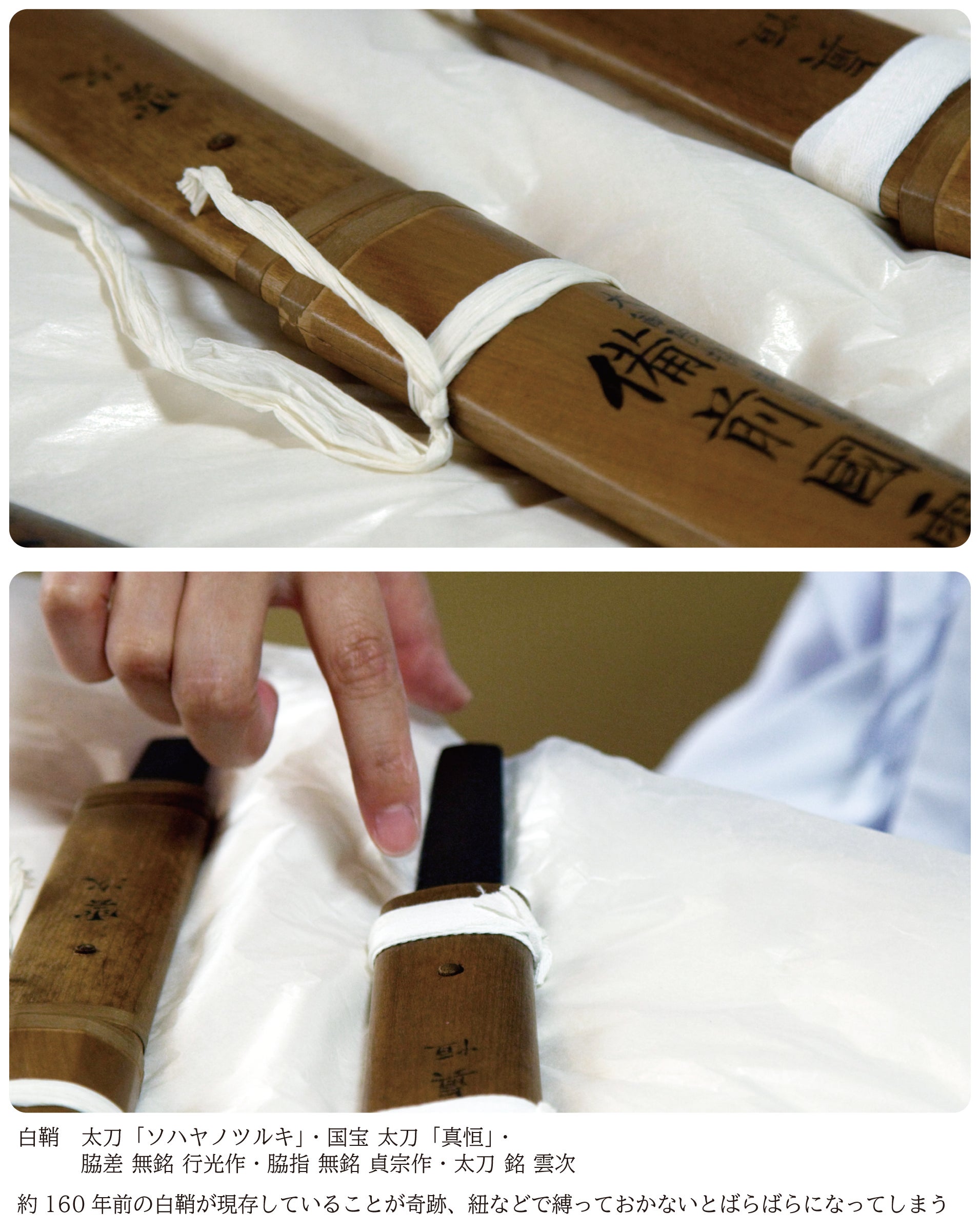 白鞘は通常10年~30年が使用期間のところ約160年ほど経過しており、文化財としての価値が非常に高い一方、奇跡と言われるほど長い期間を使用しているため、紐などで縛っておかないとばらばらになってしまう上、刀身を保管する上で、錆や劣化から守る最も重要な役割を果たしているため、刀身そのものに深刻なダメージを与えかねない状況です。白鞘は一度に新調することができないため、今回は5カ年計画で14口の白鞘を新調いたします。その間にも老朽化は進行していくため、一刻も早く着手していく必要があります。