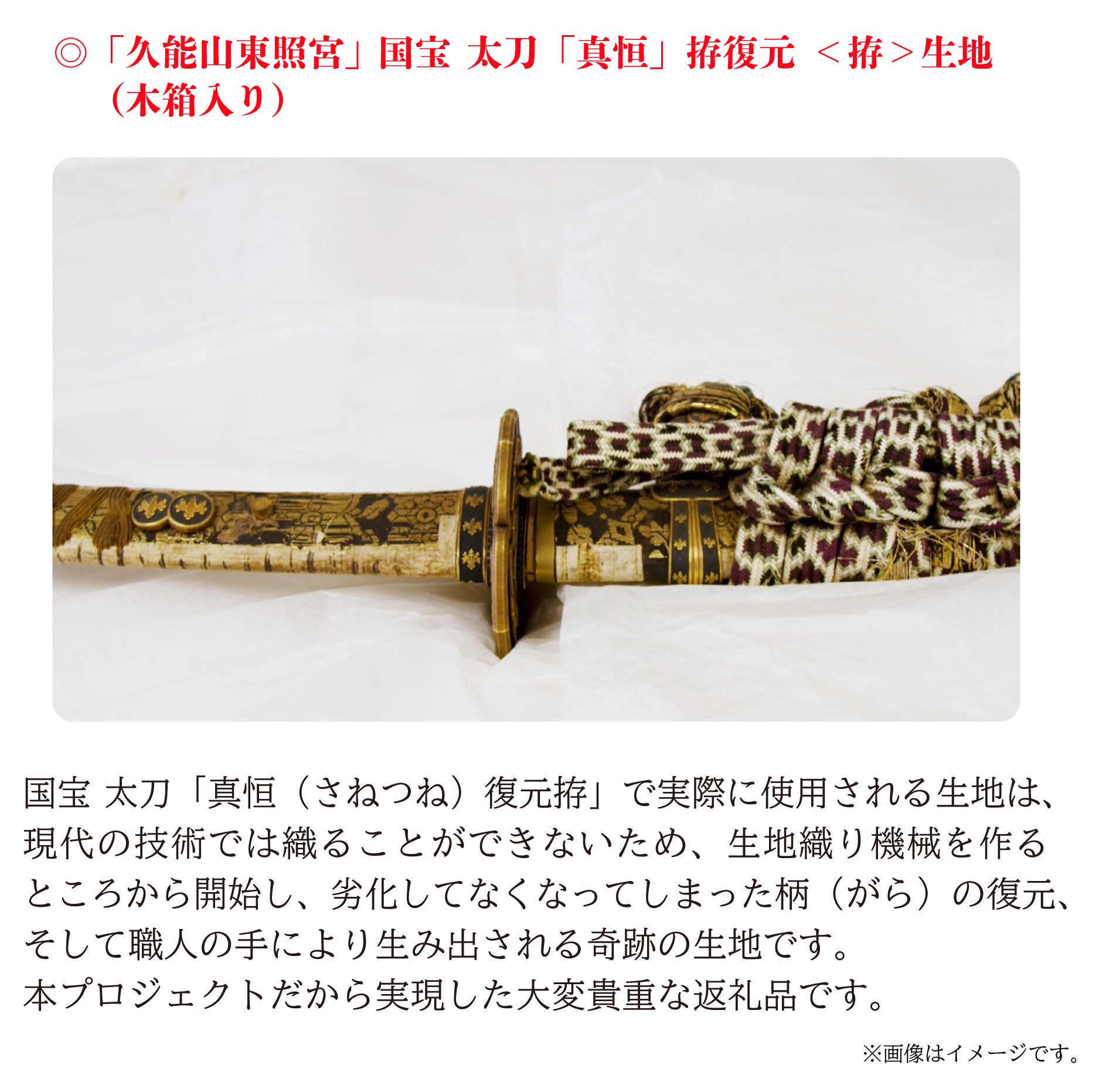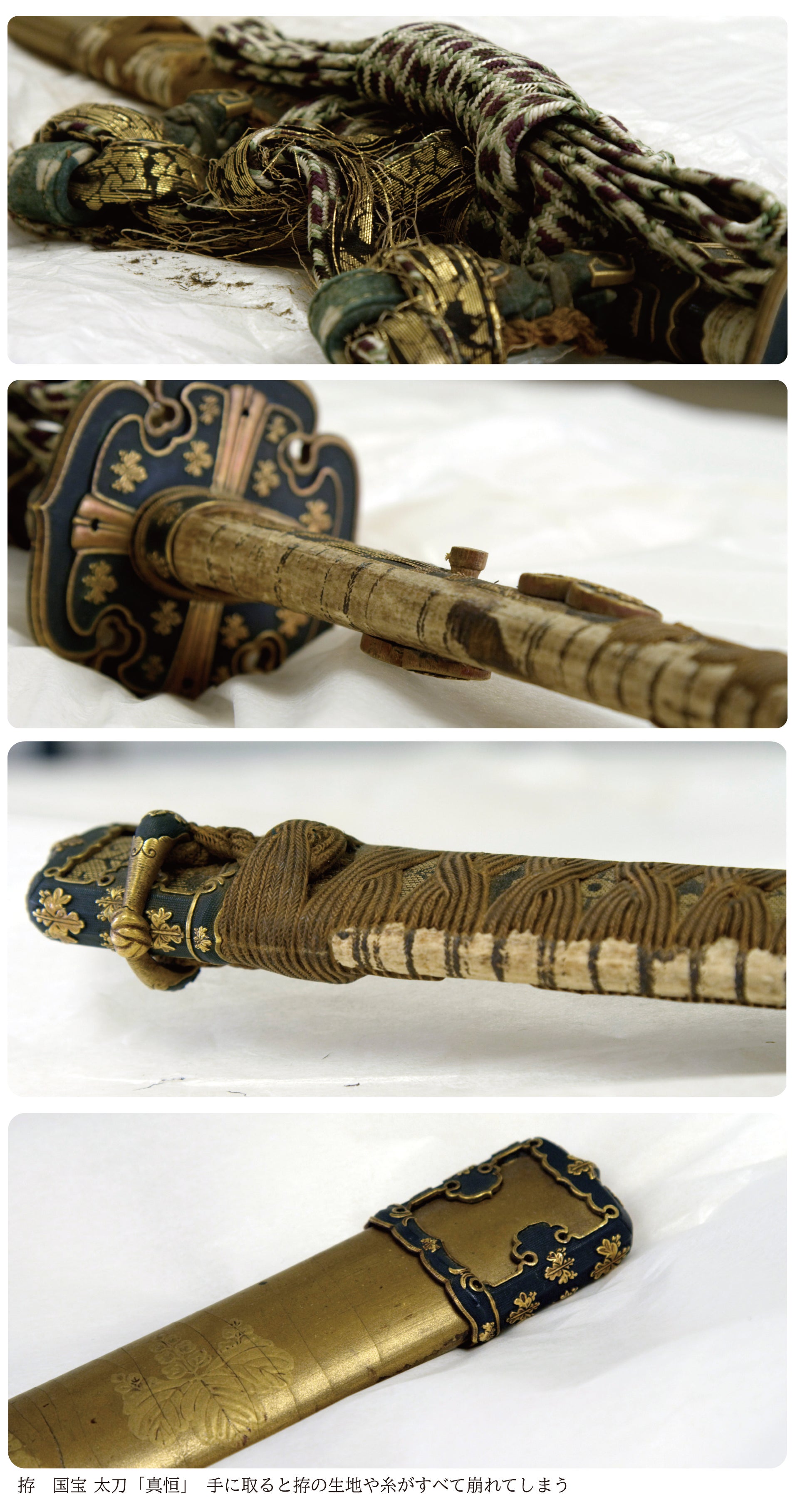 国宝 太刀 真恒の拵は、既に400年以上経過しており、手に取ると拵の生地や糸がすべて崩れてしまう状況です。展示はおろか移動することもままならない深刻な状況です。当初、修理をする予定でしたが、現存していない技術や素材で作られているため、現代で修復可能か確証がもてないため、まずは修復が可能なのかという検証が必要となり、復元模造の制作をいたします。