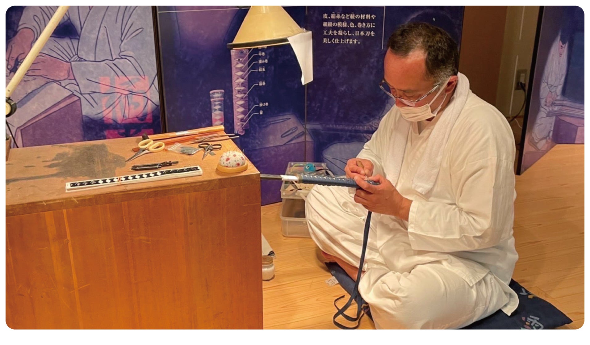 欠損してる部分が非常に多く、当時作られていたであろう材料は現代にはありません。そのため、材料そのものを用意することさえも困難を極めます。柄の復元では、生地が朽ちてしまい部分的にしか残っていません。朽ちている部分をどう繋ぎ合わせていくか、が大きな課題です。実際には、綿密に図面に起こし、当時の織りの技術や染色、材料、色味を一から再現していく必要があります。当時の柄巻きの糸は、手組みならではの風合いがあり素晴らしいものがあります。先人の職人たちが、どういう想いで巻いてきたのかということをしっかりと理解することも重要です。今回の修復は私にとっても挑戦と思っています。