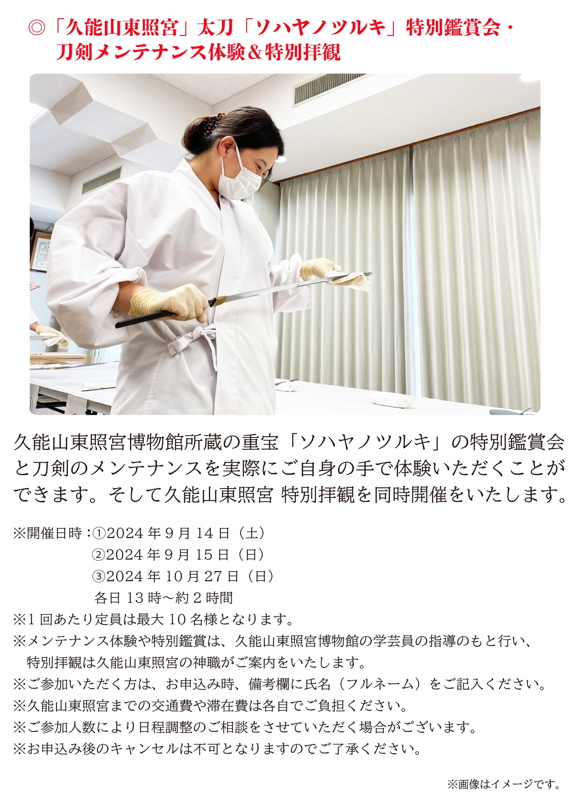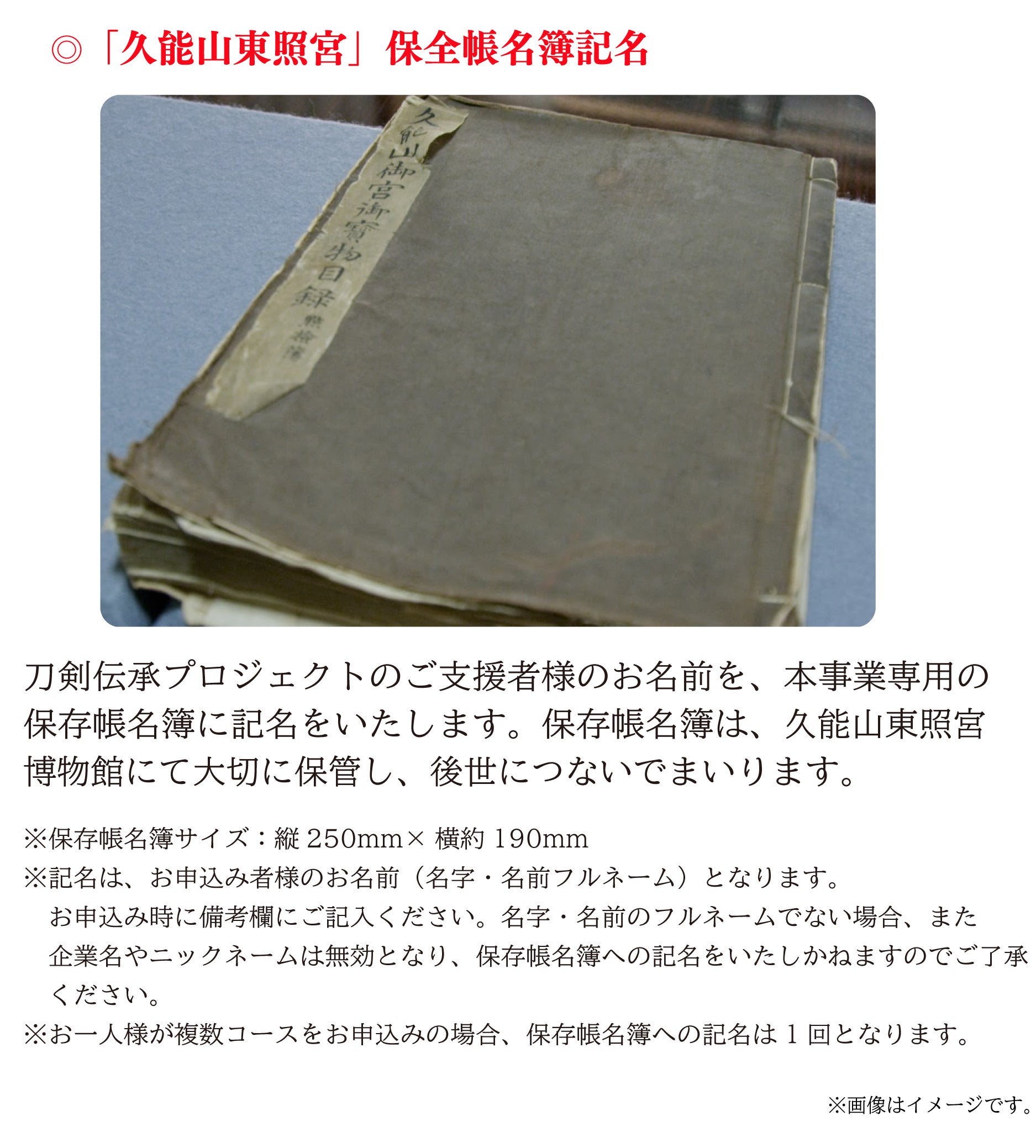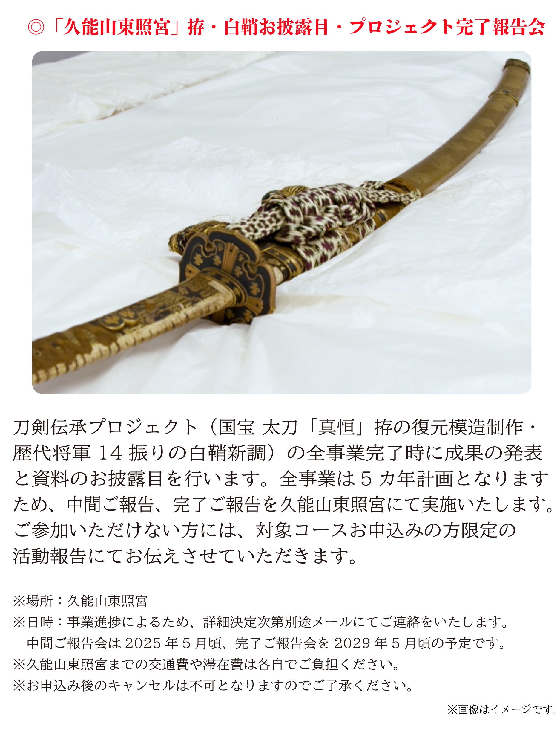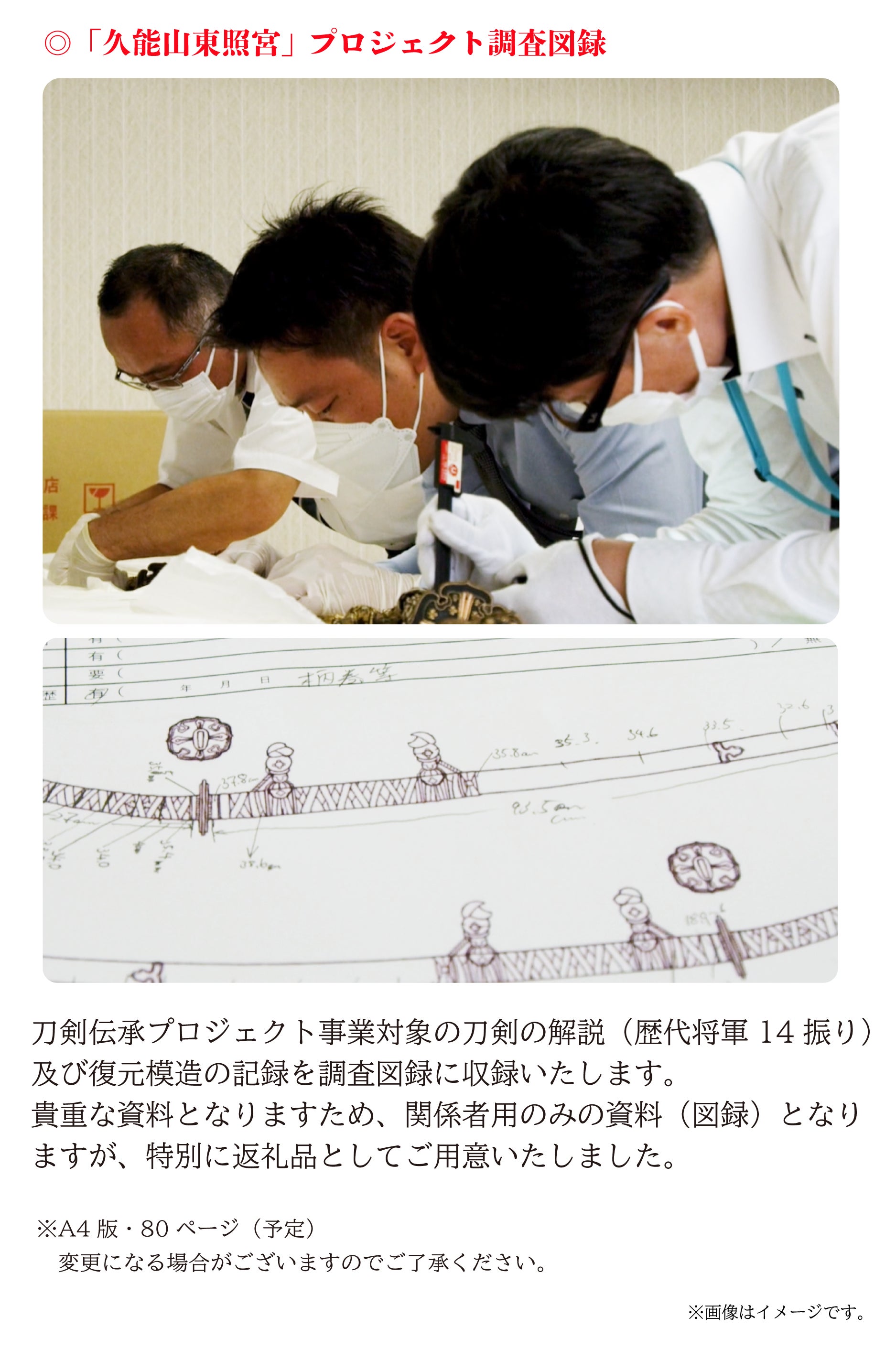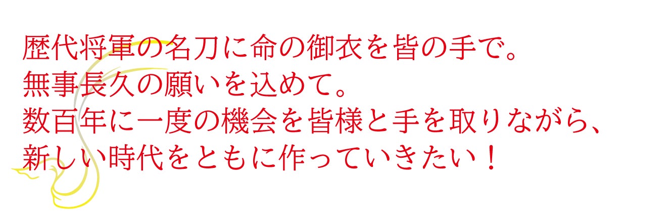 久能山東照宮は、刀剣のまことの輝きと命脈を永遠のものとするために、未知への挑戦に一緒に参加をしてくださる方々を全国から募集いたします。そして数百年に一度の機会を皆様と手を取りながら、新しい時代をともに作っていければと思っております。