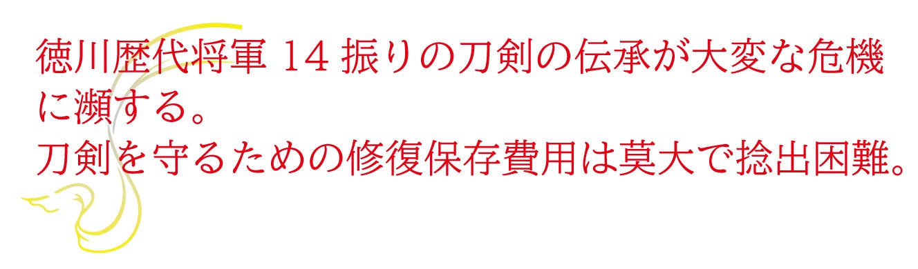 このたび徳川歴代将軍14振りの刀剣の伝承が大変な危機に瀕しております。刀剣を守るために必要不可欠な外装具である拵(こしらえ)と白鞘(しらさや)が数百年もの間、刀剣を守り続けていたものの激しい老朽化により朽ち果ててしまう状況に陥り、一刻も早い修復と新調が急務となっています。