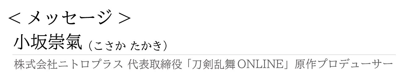 ゲームやアニメを制作している株式会社ニトロプラスの小坂 崇氣(こさか たかき)と申します。私は刀剣を題材にした「刀剣乱舞(とうけんらんぶ)ONLINE」というゲームの原作プロデューサーをしております。