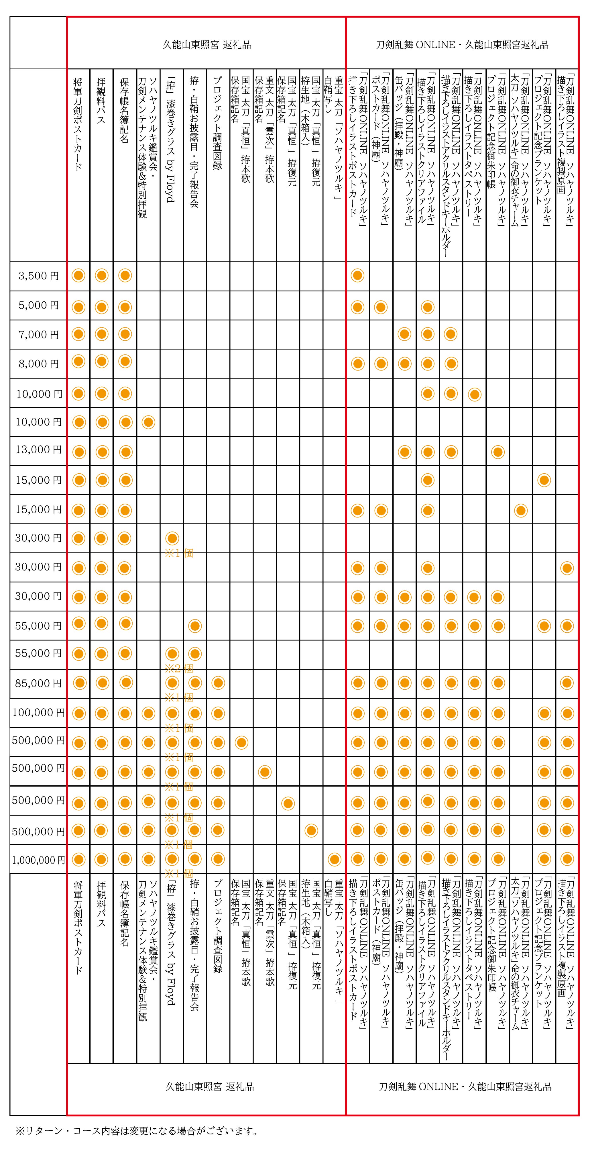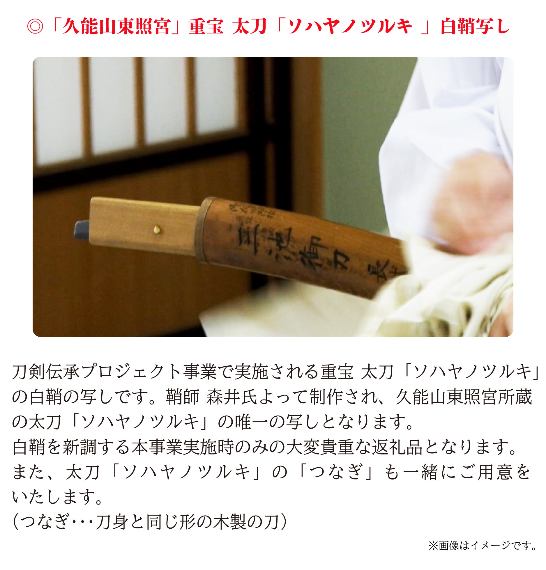 リターン(返礼品)は本企画だから実現できる、久能山東照宮の重宝 太刀「ソハヤノツルキ」白鞘の写しや実際に国宝 太刀「真恒(さねつね)」拵の復元模造に使用する拵(こしらえ)の生地、そして職人・アーティストがチームとして集う株式会社studio仕組やプロダクトレーベル「Floyd(フロイド)」がプロデュースした「久能山東照宮」返礼品の他、イラストレーター三輪士郎さんによる「刀剣乱舞ONLINE」の刀剣男士「ソハヤノツルキ」プロジェクト記念描き下ろしイラストを使用した特別返礼品など全21コースをご用意いたしました。