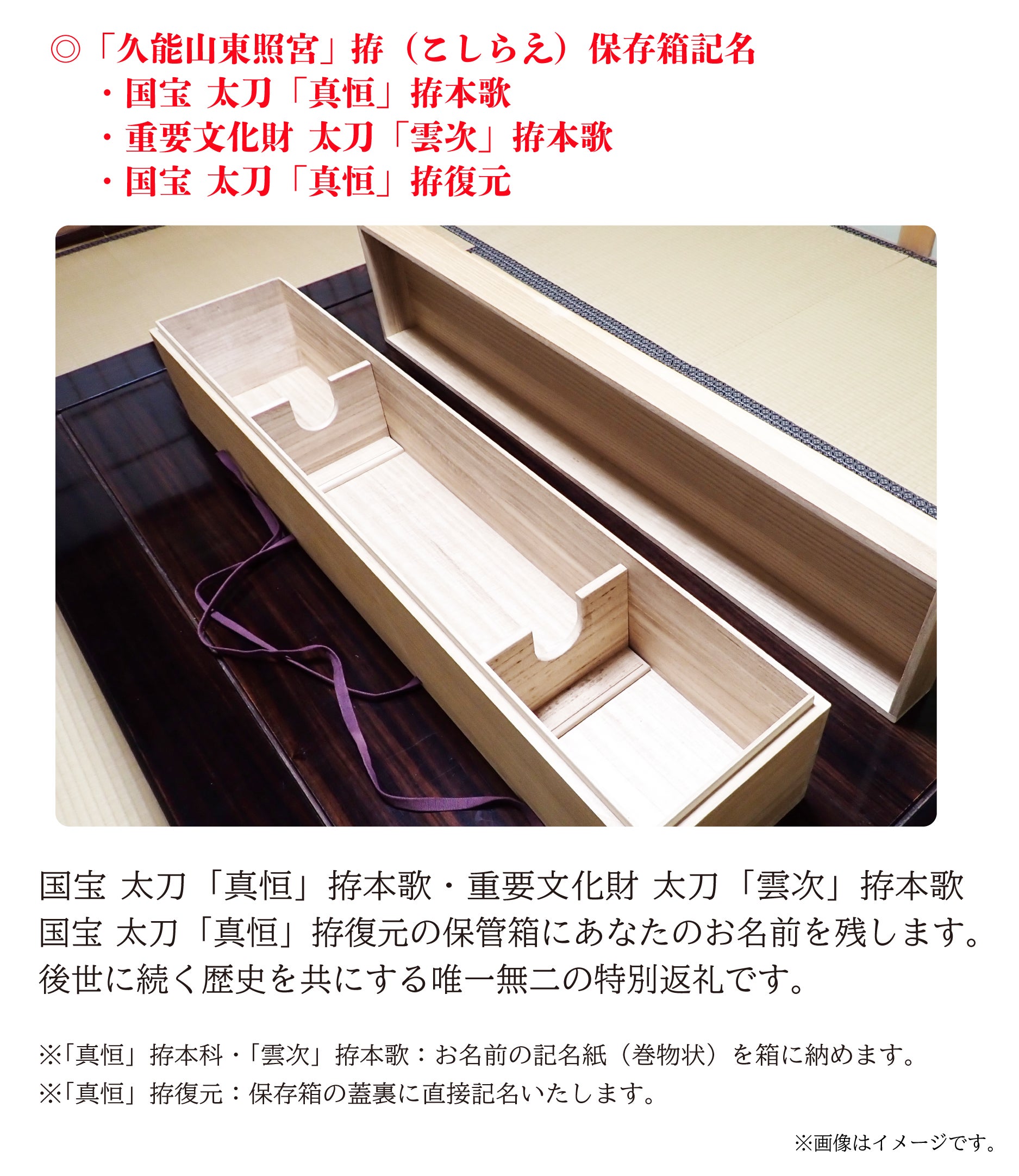 2025/03/22 16:59この度は【久能山東照宮『刀剣伝承』~ソハヤノツルキなど歴代将軍の名刀に命の御衣を皆の手で~】にご支援をいただきまして誠にありがとうございます。支援者の皆様には先日ご報告させて頂きましたが、この度、皆様にご支援頂きました白鞘の新調事業の第一弾、及び太刀拵の保存箱の製作が完了しました。白鞘の新調事業は今年度より5ヶ年で行う予定で、今年度はその中から・国宝 太刀 銘 真恒・重要文化財 太刀 銘 雲次の白鞘の新調、及び両太刀の拵の保存箱を製作致しました。白鞘は普段展示では見られないものですので、こちらはお写真にて公開させて頂きます。国宝 太刀 銘 真恒白鞘(上が旧白鞘、下が新調されたもの)重要文化財 太刀 銘 雲次白鞘(上が旧白鞘、下が新調されたもの)これまで使用していた白鞘は、今から約160年前、江戸時代末期に作られたものを使用していました。しかし経年の劣化により刀身の保護が難しい状況になった事からこの度、白鞘を新調する事となりました。そして今年度白鞘を新調した2口に附属する太刀拵は当宮所蔵の太刀拵の中でも比較的古い時代に製作された為、状態の劣化が進んでおります。そこでより安全に保管をする為の箱が製作され、今後は展示にも活用出来る様にして頂きました。国宝 桐紋絲巻太刀拵(真恒拵)保存箱※桐葵紋絲巻太刀拵(雲次拵)も同様の保存箱です。江戸時代末期に製作された旧白鞘は大切に保存し、今回新たに製作された白鞘にて刀身を保護して参ります。残りの4年で他の重要文化財の刀剣の白鞘を順次新調致します。(太刀拵の保存箱の製作は本年度のみです)今後太刀拵、及び旧白鞘の展示と共に、特定のコースにてご支援頂きました皆さまに向けての報告会を開催予定です。展示についての情報は当宮ホームページ、または公式X(旧Twitter)でご確認ください。 もっと見る