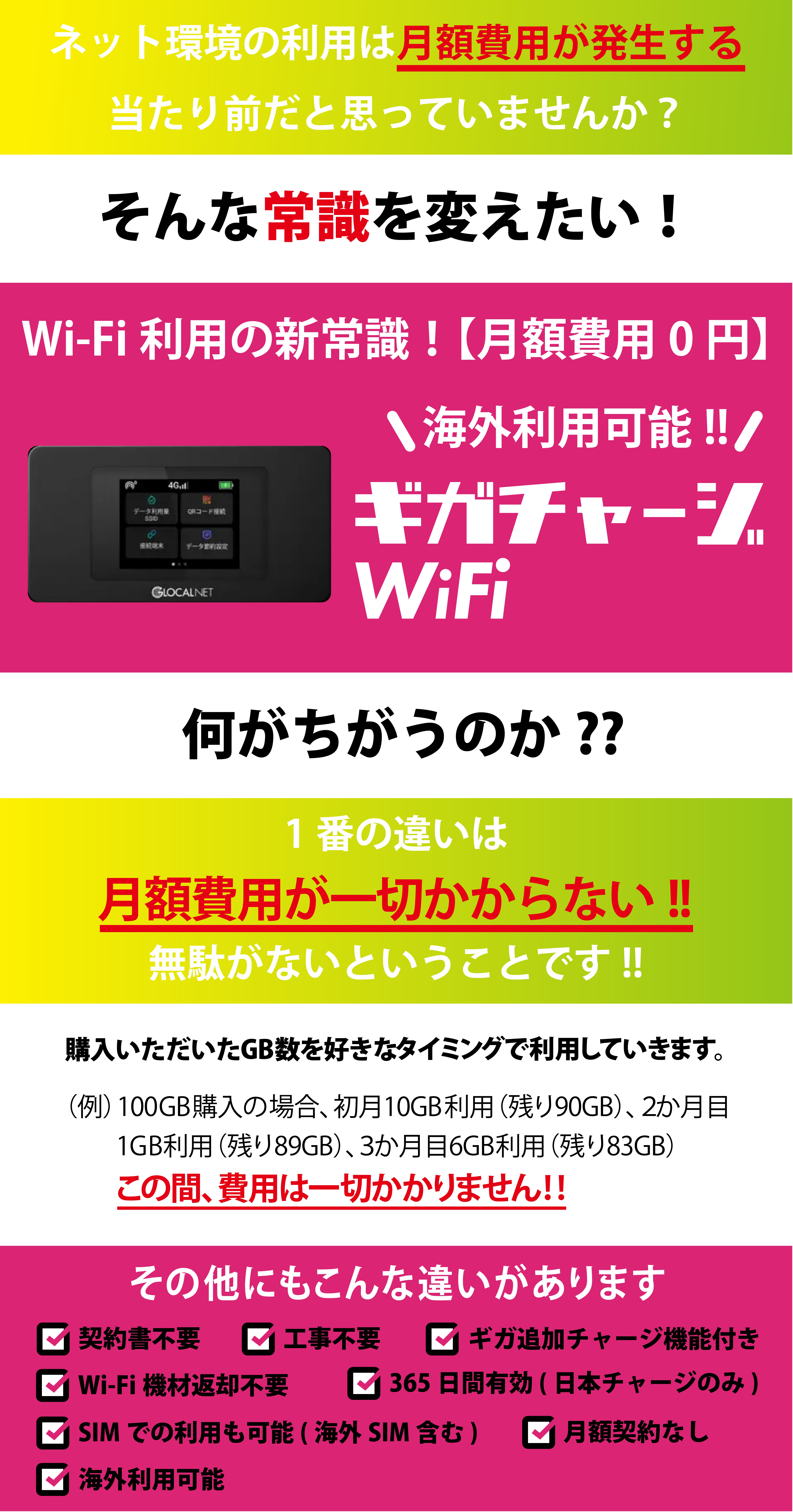 【月額費用0円】必要なGBを購入(チャージ)して利用するので無駄な費用発生の無いモバイルWi-Fiルーター!!【海外利用可能】SIMカードでもチャージでも利用可能!!【国内ギガ有効期間365日】長い期間利用できるので安心!!
