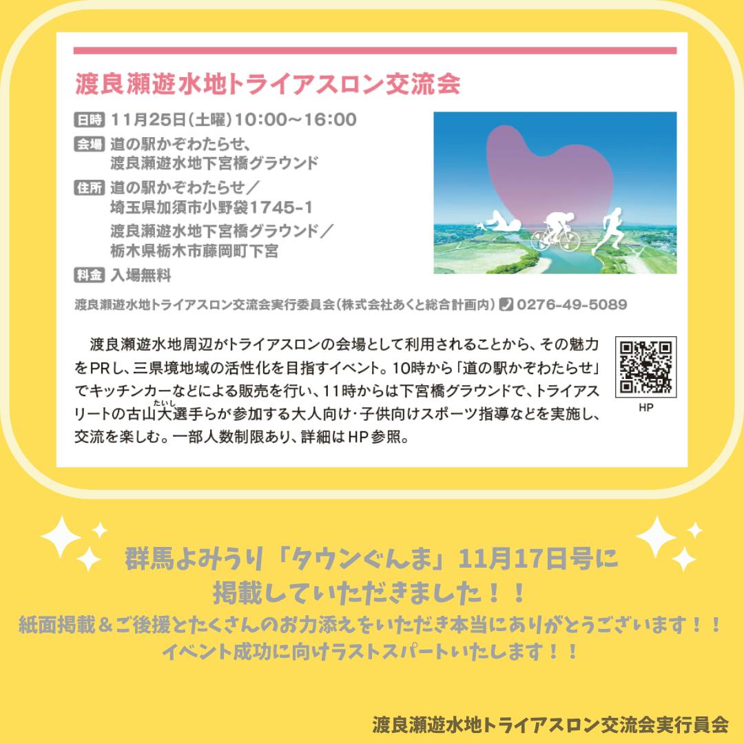株式会社群馬よみうりさんが発行しているタウン情報誌「タウンぐんま」の11月17日号に、渡良瀬遊水地トライアスロン交流会の情報を掲載していただくことができました!!