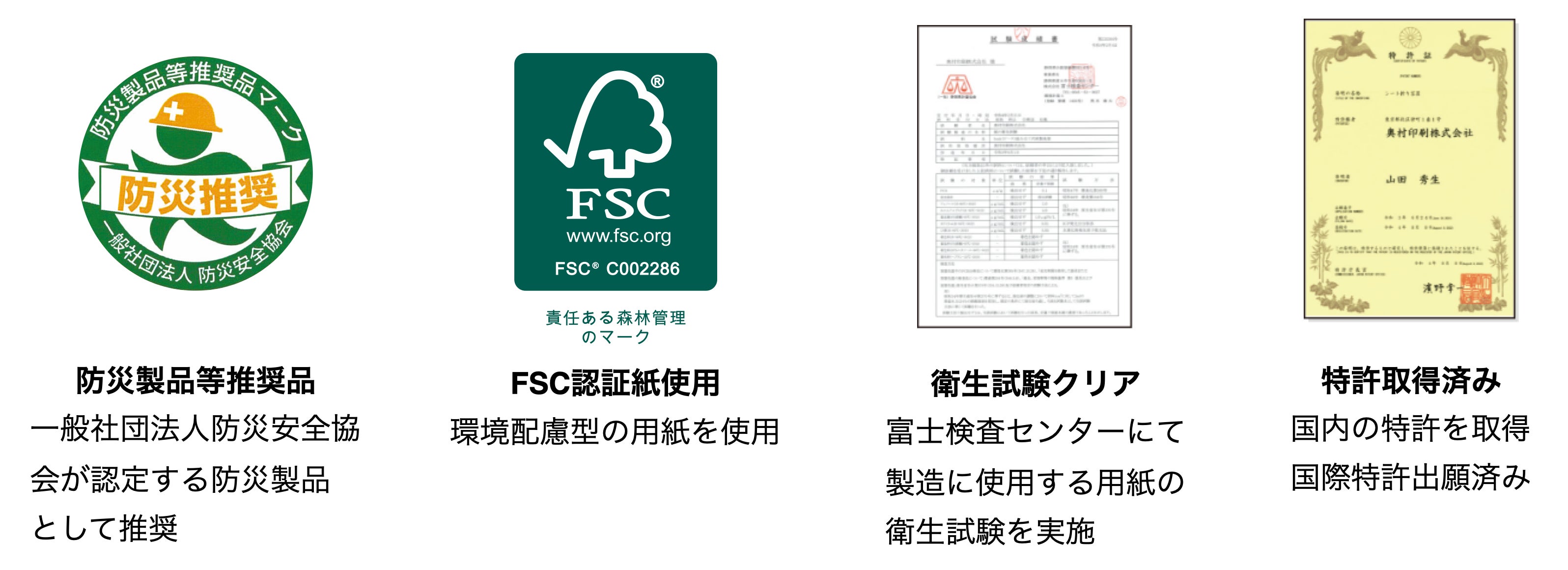 「折り紙食器 beak」は特許の取得、紙の衛生試験、防災製品推奨品としての認証を受けております。FSC認証紙とは、紙の製造用の樹木の伐採後に植樹をしたという証明です。
