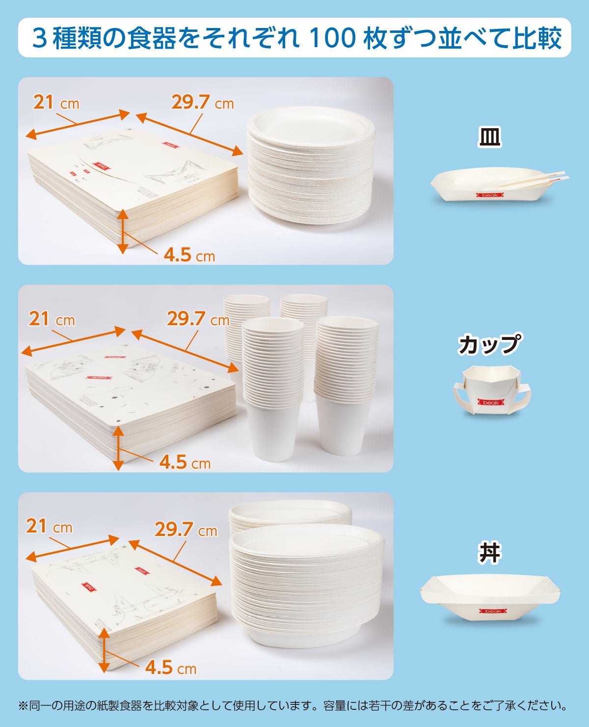 立体的な紙製食器は保管時にスペースが必要になったり、保管の仕方によってはいざ使う場面で潰れていて使えないということもあります。この「折り紙食器 beak」なら保管時はA4サイズのシート状で1枚の厚さは0.5mm以下です。A4サイズのスペースに高さ45cm程度で1000個の食器が確保出来ますし、シート状で保管されるので潰れる心配もありません。