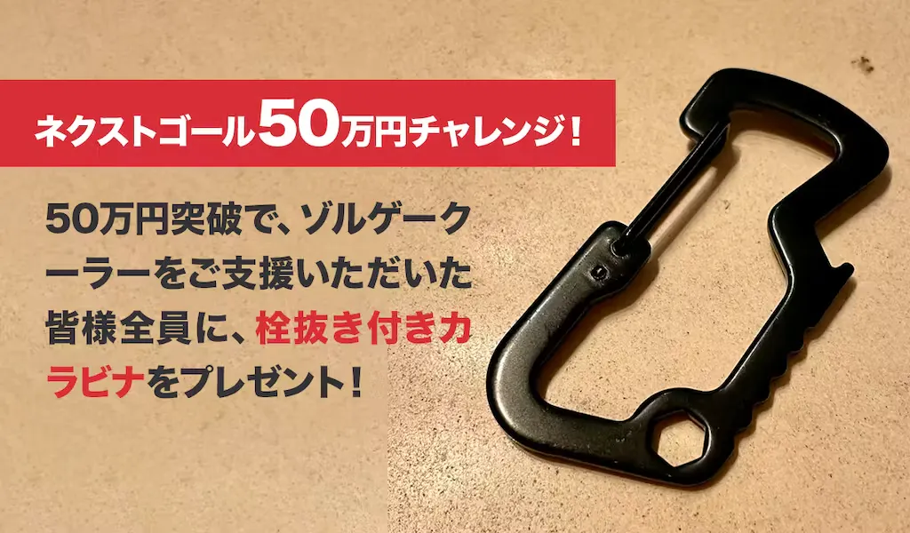 50万円突破で、ゾルゲークーラーをご支援いただいた皆様全員に、栓抜き付きカラビナをプレゼントいたします!