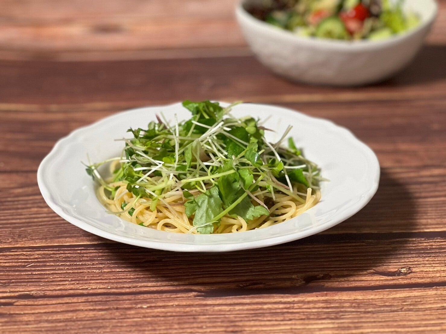 薬味にはカイワレ、三つ葉、ミョウガを上からたっぷりのせています。