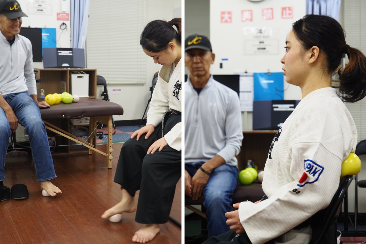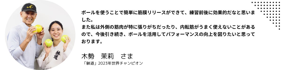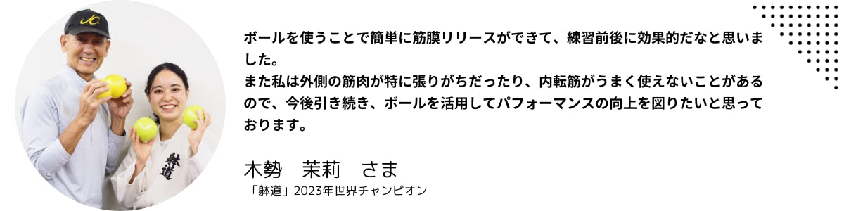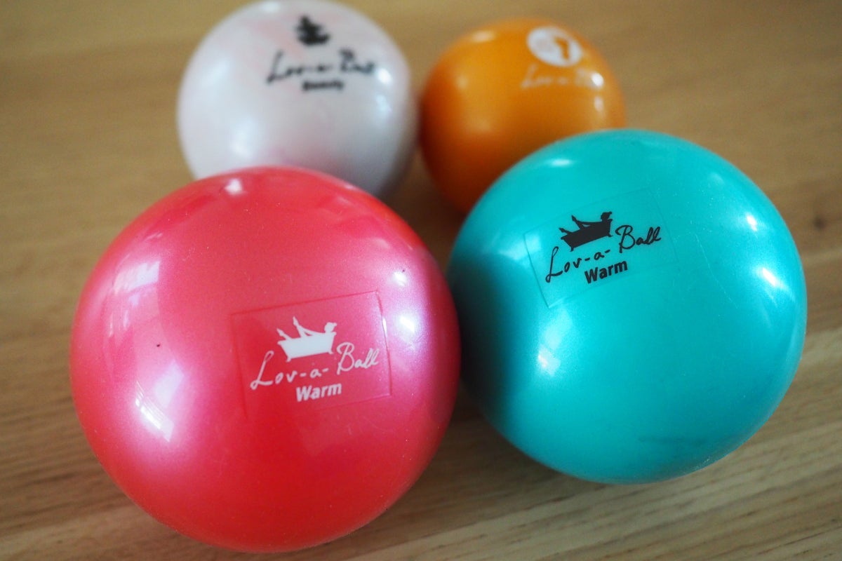 持ってみるとなんとも言えないもちもちぷよぷよの感触と「重さ」に驚きます。軽いのではなく「重い」のです。ボールは大小2種類あり、大サイズのボールは1個約400g。中に液状のゲルが入っているのですが、身体をほぐすだけではなく、自宅での手軽なトレーニングにも使えます。ボールに体重をのせることによるボールの反発で、筋肉をじっくりほぐしていきます。