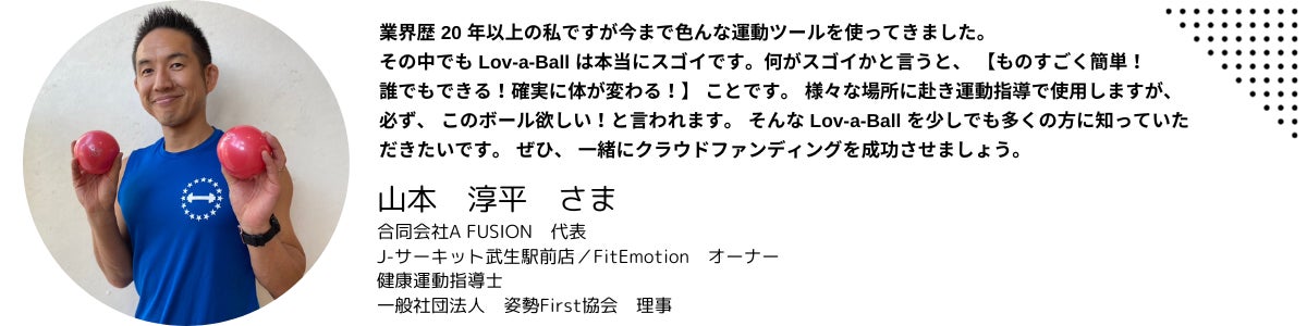 この油圧マシンにも話せば長い開発エピソードがあるのですが、今回のクラウドファンディングでは同じく私が開発した「ラヴァボール(Lov-a-ball)」を全国に広めて、肩こりに悩んでいる人をゼロにしたい!と思っています。