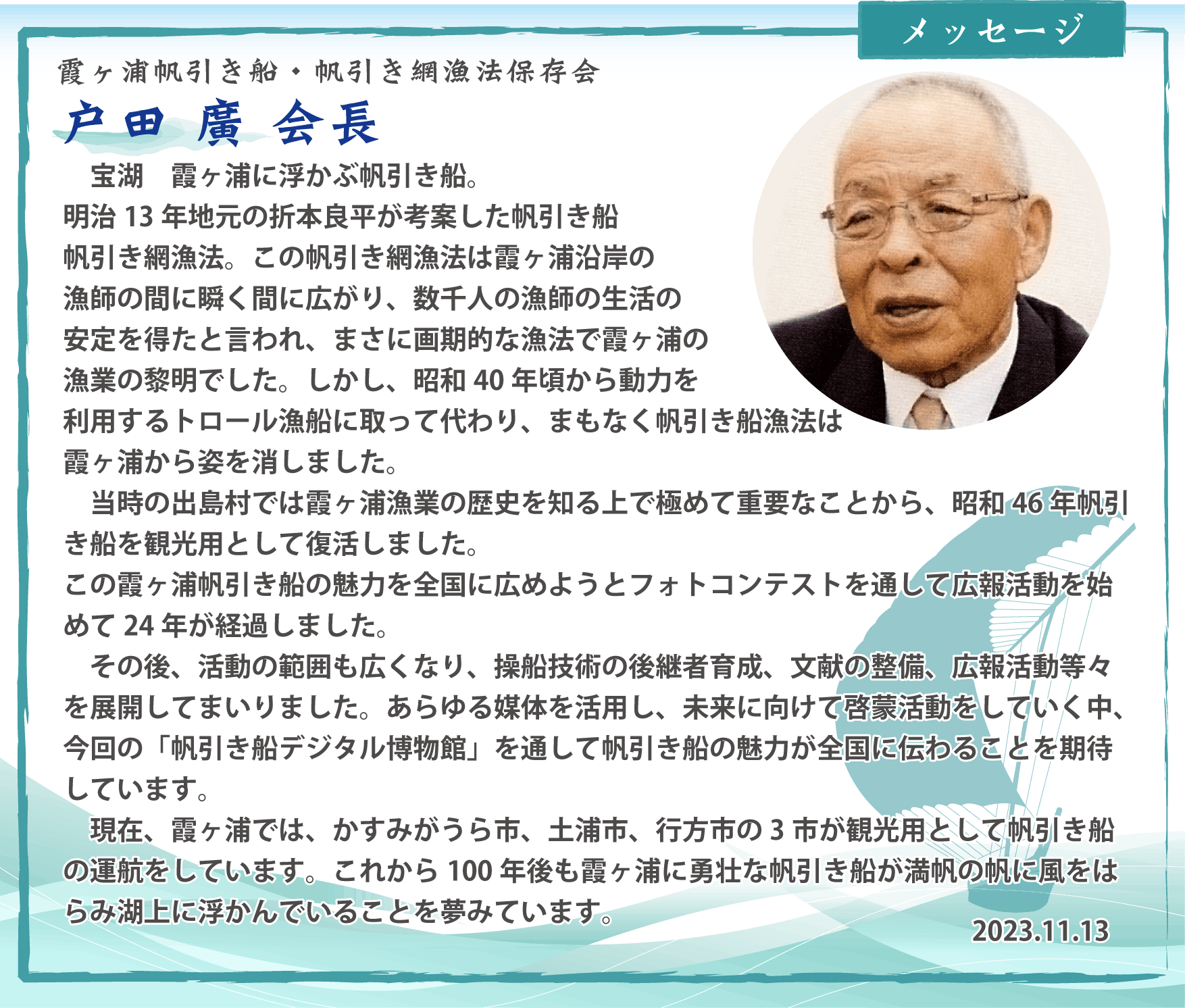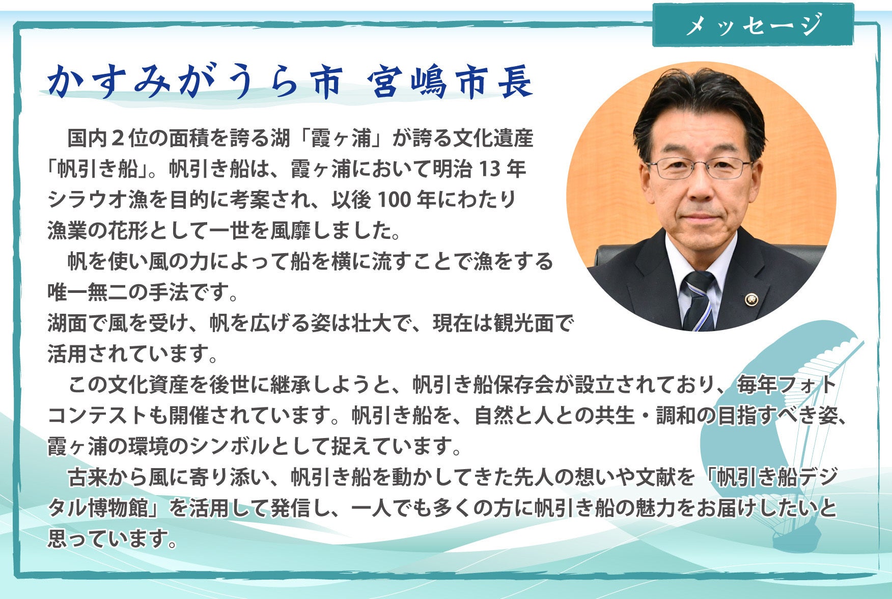 「帆引き船デジタル博物館」を通して帆引き船の歴史や文化のみならず霞ヶ浦の今を世に伝えることで、霞ヶ浦の環境にも興味を持って頂き、皆さんと共に霞ヶ浦を盛り上げたいと願っております。