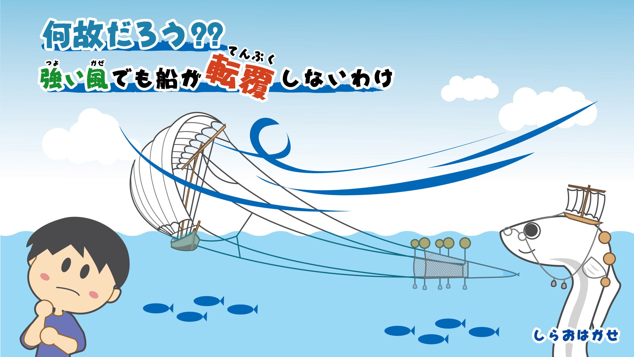 帆引き船は霞ヶ浦が生んだ極めて独創的な漁船です。風を巧みに操つることで、船が横向きにもかかわらず、一定の速度で水中の網を引くことが出来ます。実は、水中を引けるという事が帆引き船の優れた能力の一つで、それ故に湖を回遊する「シラウオ」や「ワカサギ」を捕らえることが可能なのです。そしてその能力を生み出しているのが「つり縄」と呼ばれる帆桁(ほげた)と「網(あみ)」を結んでいる「綱(つな)」なのです。この「つり縄」こそ他の漁船には見られない帆引き船最大の特徴であり、帆引き船メカニズムの鍵ともいえるものです。
