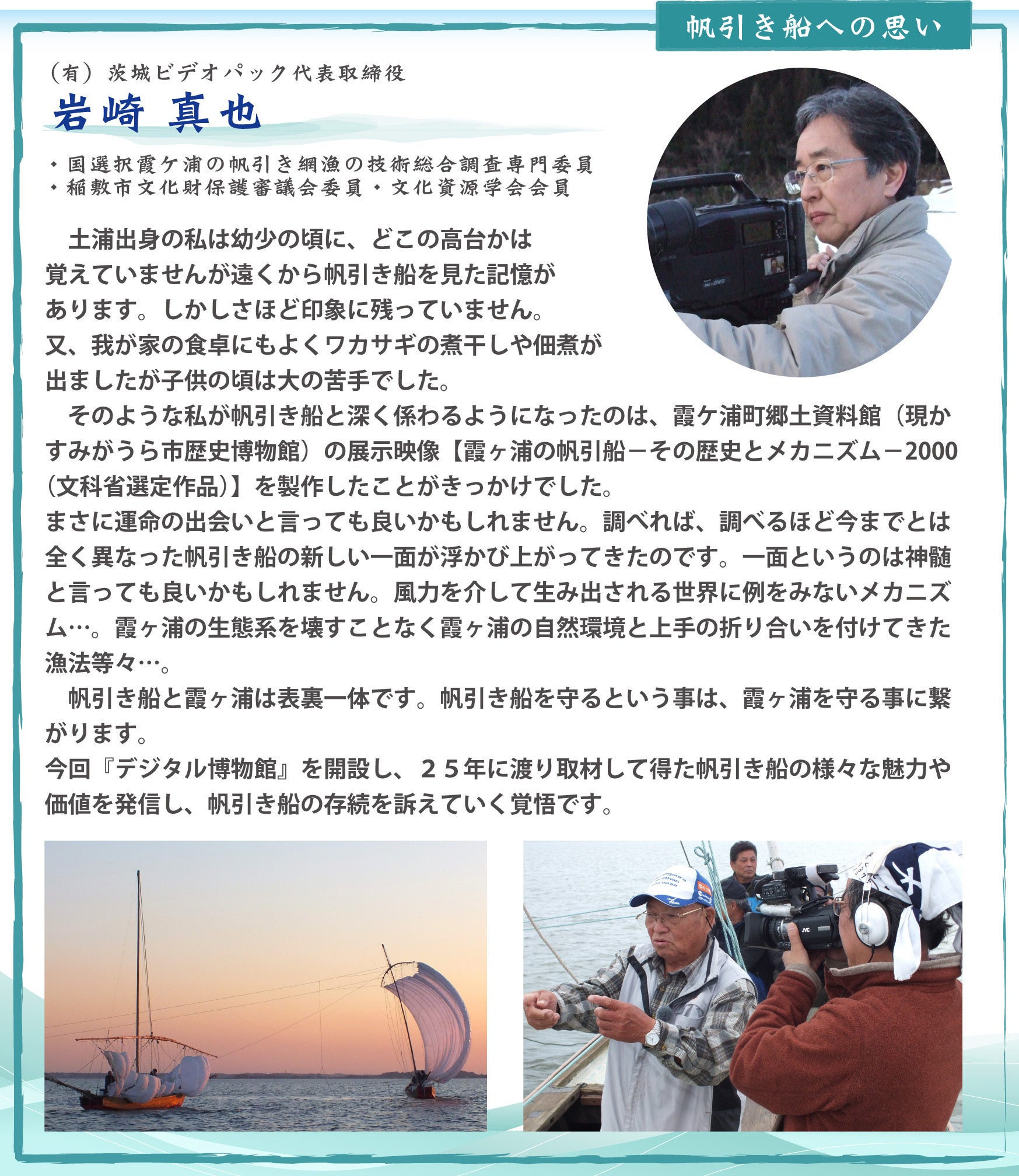 帆引き船の研究や映像製作に携わって25年。その間に養われた知識と思いを込めて、帆引き船のすべてを世界に向け発信していきます!それが『帆引き船デジタル博物館』の使命なのです。(茨城ビデオパック代表取締役 岩崎真也 記)