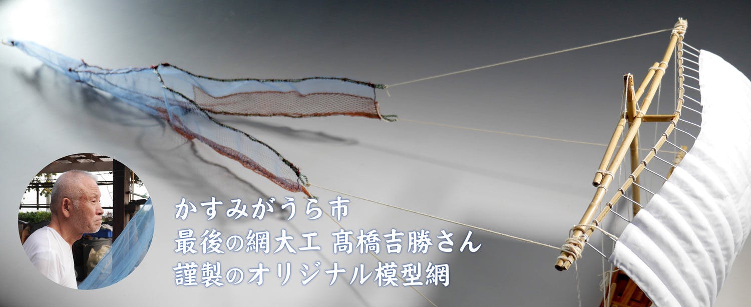 吉謹製帆引き網模型セット網は、かすみがうら市最後の網大工髙橋吉勝さん謹製のオリジナル模型網です。大きさは帆引き船の模型に合わせて製造されています。通常の帆引き網と同じ材料と方法で作り上げた貴重なオリジナル製品です。(限定20セット)