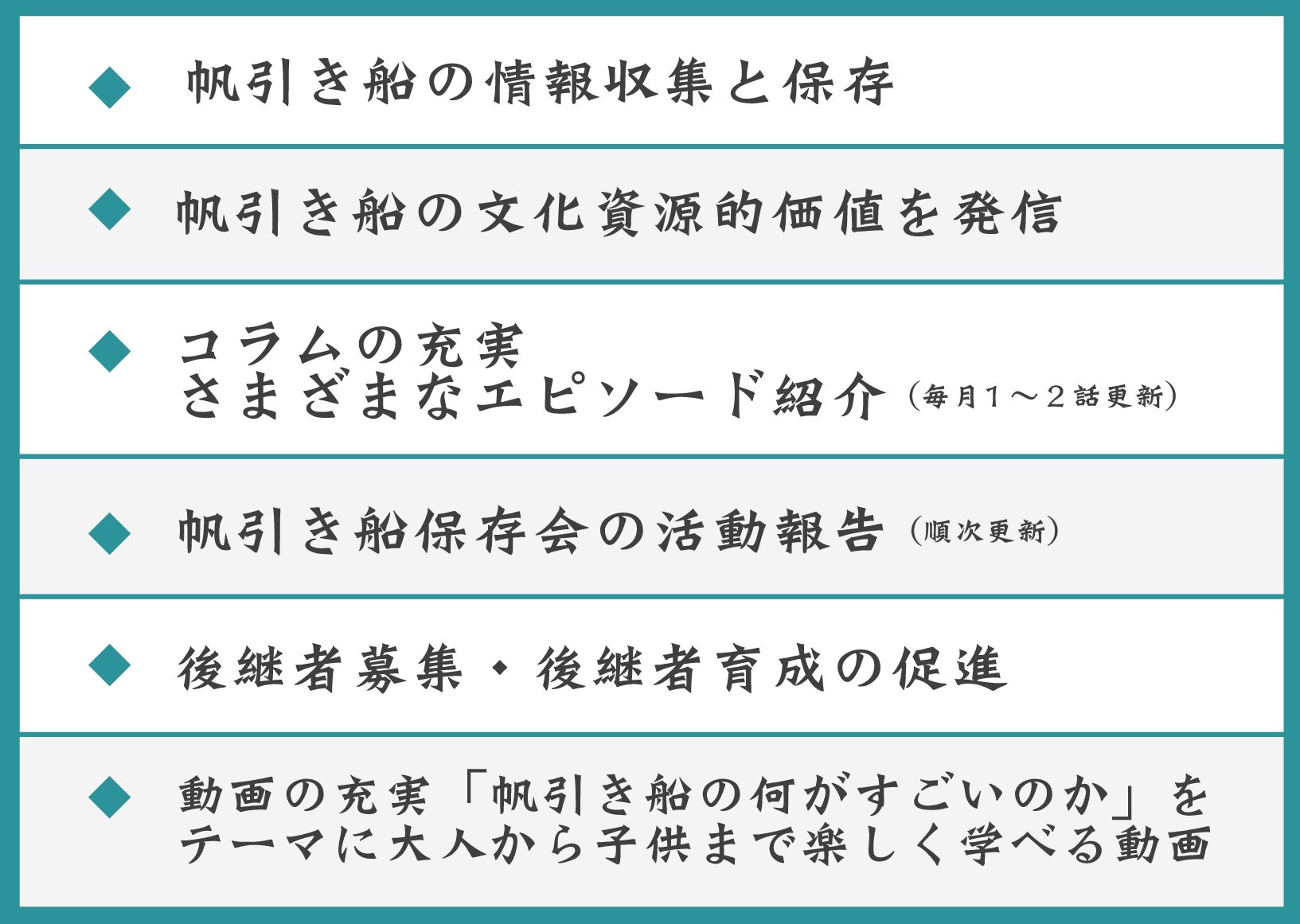 一部コラムを設け、一定間隔で帆引き船の様々なエピソードを発信する。(23年間の記録映像・記録写真・調査資料・インタビュー等など蓄積した材料があるので題材に事欠くことはない)